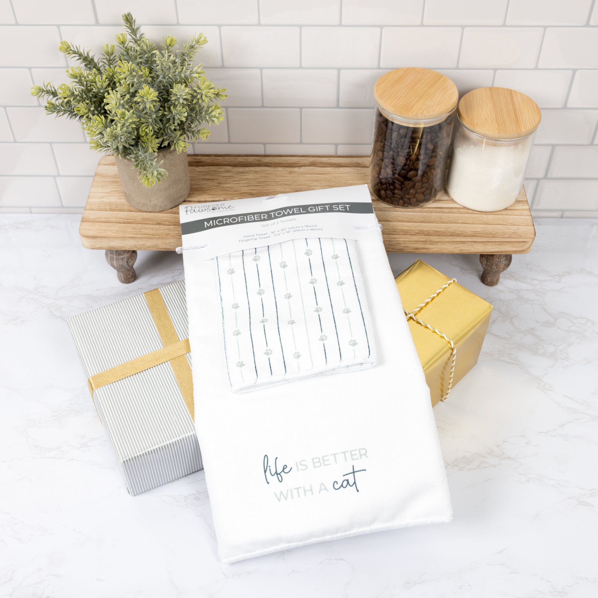 - IN-HOUSE DESIGN: The smaller towel has a light and dark gray pawprint and striped pattern on a white background and is printed on by sublimation printing. The larger has a "Life Is Better With A Cat" light and dark gray sentiment on the white towel's center bottom.