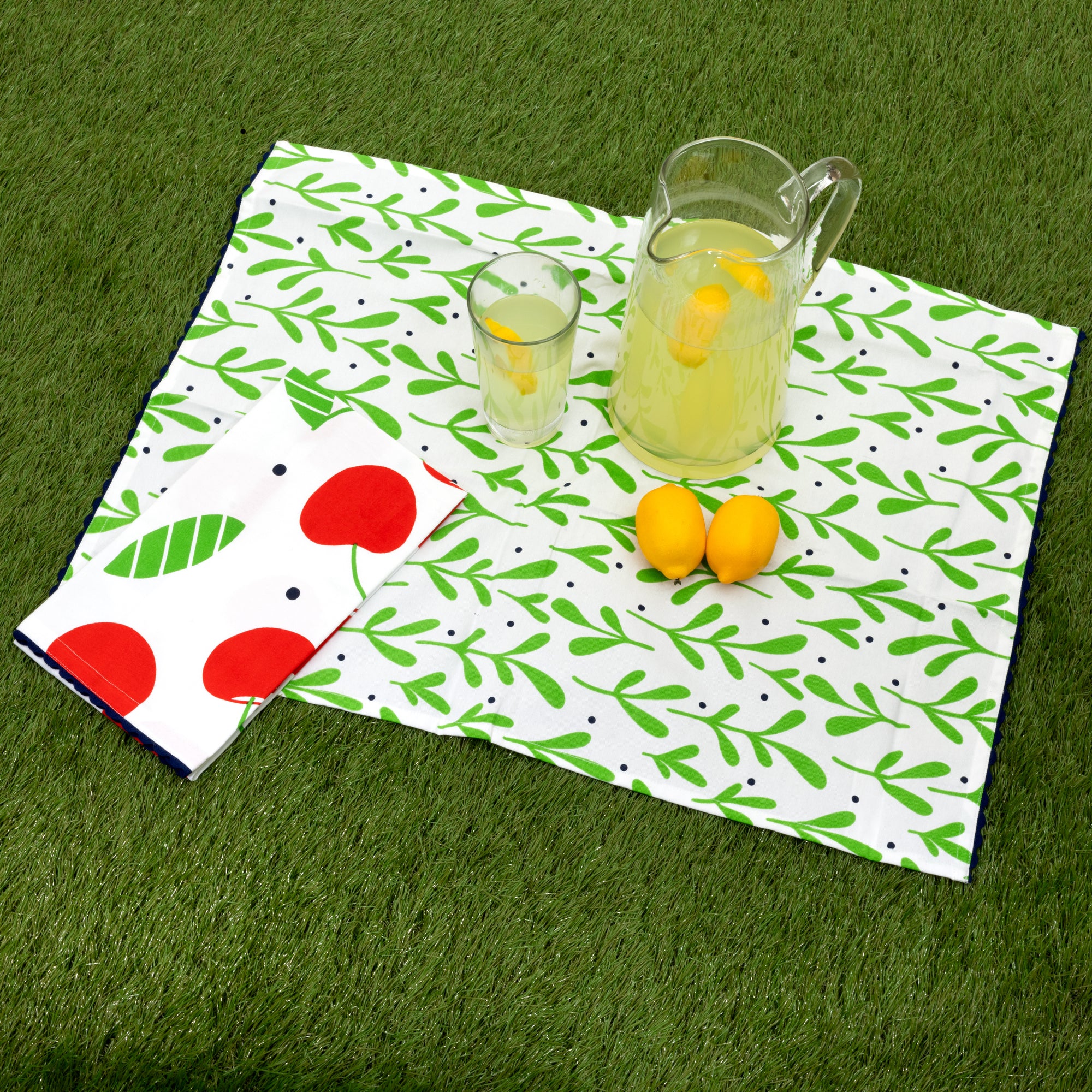 - IN-HOUSE DESIGN: Each towel bears its own design. One with large red cherries with green stems, navy blue polka dots, and navy blue wavy trim on a white background. The second towel features greenery, navy blue polka dots, and navy blue wavy trim on a white background.