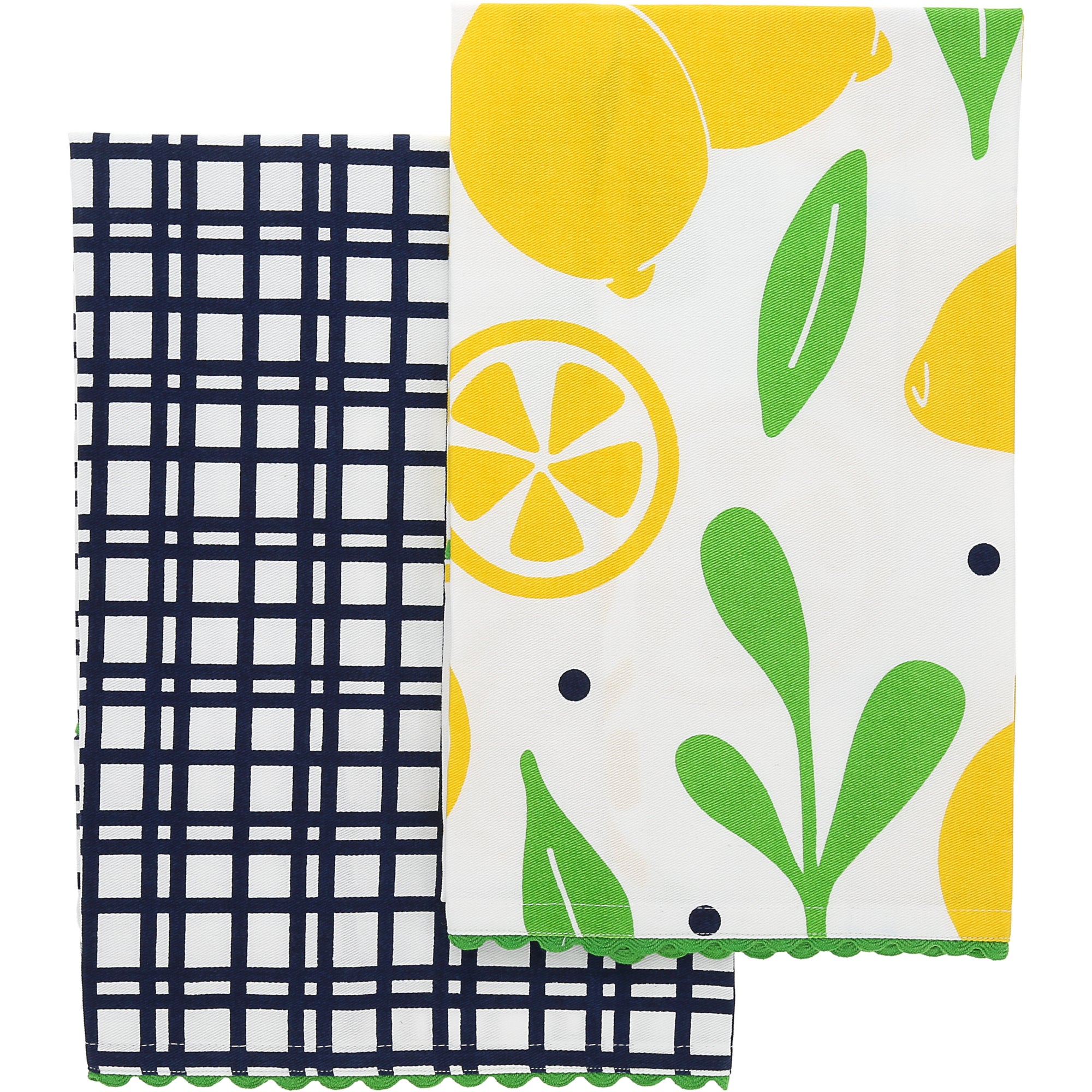 - IN-HOUSE DESIGN: Each towel bears its own design. One with large lemon halves and wholes with green stems, navy blue polka dots, and green wavy trim on a white background. The second towel features navy blue plaid on a white background and green wavy trim.