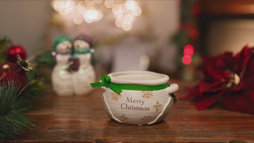 • PREMIUM QUALITY: This 9 oz 100% soy wax pine tree fir-scented candle fills an organic-shaped ceramic vessel that will fit into modern neutral-styled homes. The single lead & nickel-free cotton wick provides a smooth burn when each wick is cut down to 1/4" after burning. The candle will burn for 20-30 hours in total. The front of the candles has an actual bow-tied grosgrain ribbon, a resin charm, mini handles, a snowflake design, and a "Merry Christmas" sentiment.