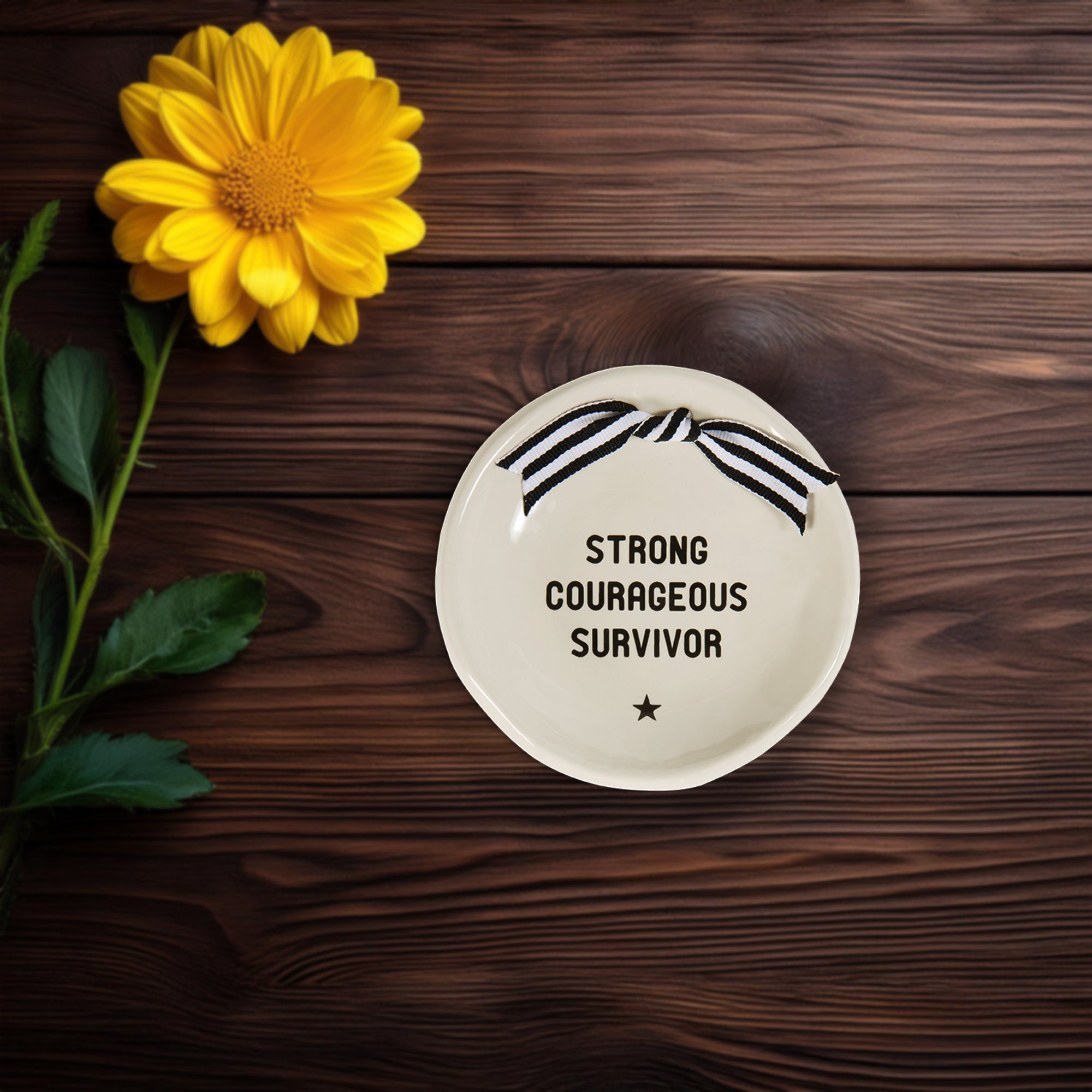 • IN-HOUSE DESIGN: Featuring the inspiring words "Strong Courageous Survivor", this dish serves as a daily reminder of strength and resilience. The design is complemented by a bold black star detail and a removable black-and-white striped ribbon, adding a decorative touch to its timeless look.