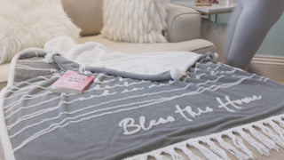- IN-HOUSE DESIGN: Risen cursive sherpa "Grant Us Peace And Serenity In All Things, Let Our Family Overcome Whatever Life Brings. May We Find Happiness Big And Small, And Live In Comfort Through It All. This Home Is A Blessing From Above, To Be Filled With Wonderful Memories And So Much Love. Bless This Home" sentiment is conveyed by wave-like thread lines connecting the ends of the words to the edge of the blanket on a beautiful soft gray background.