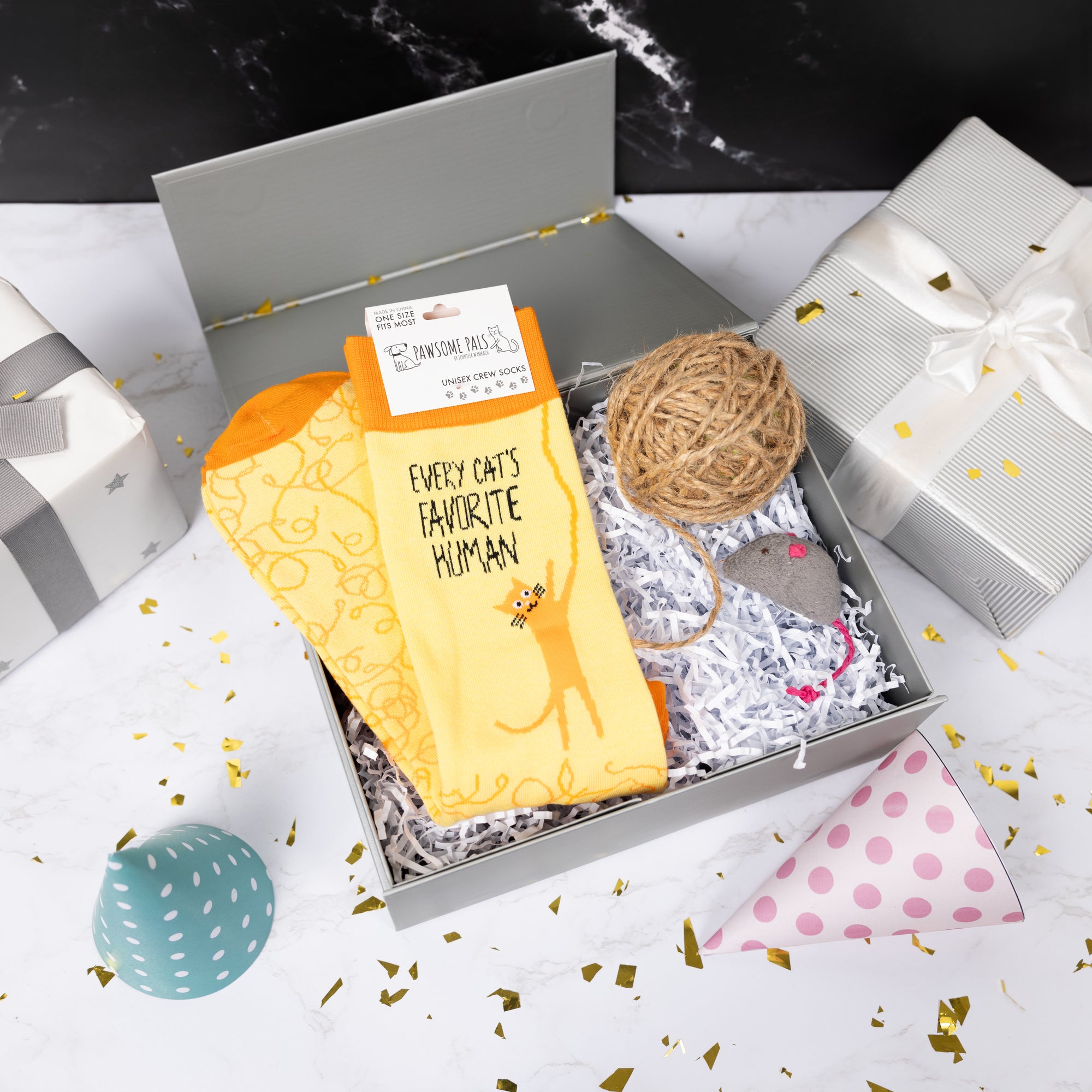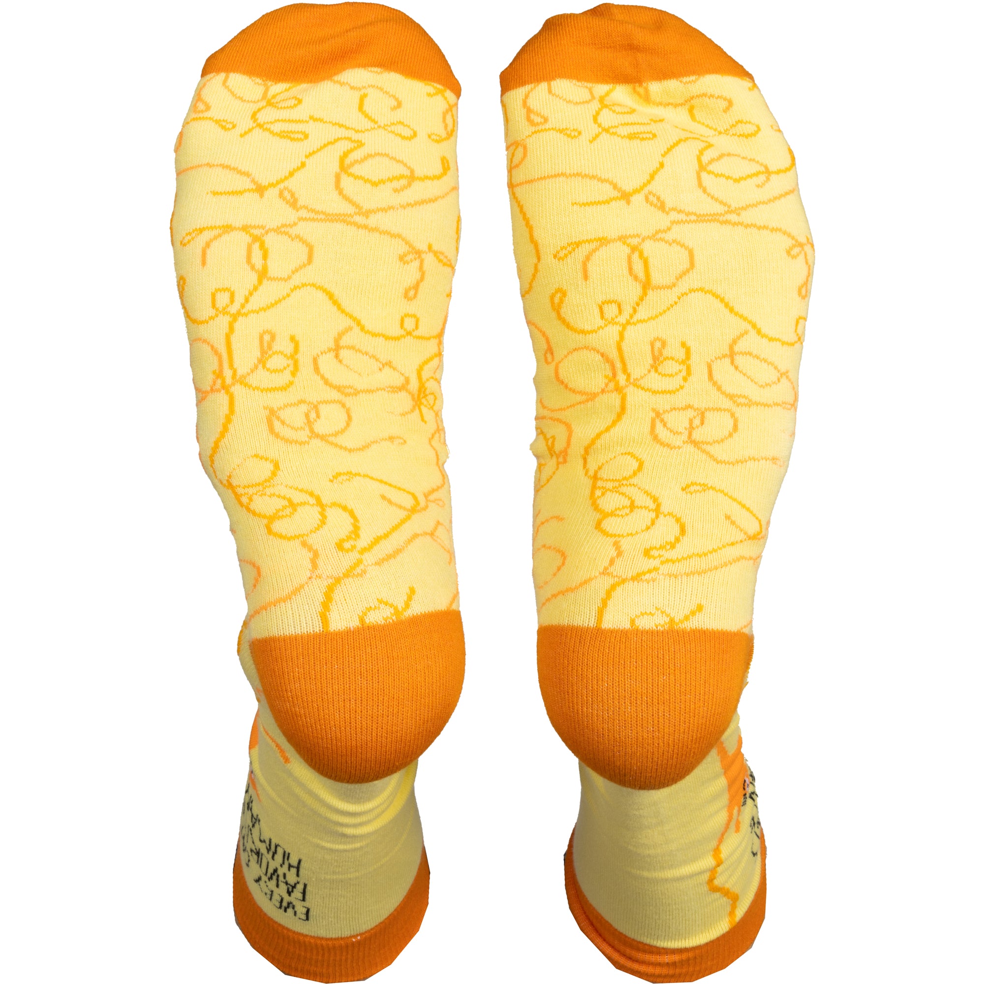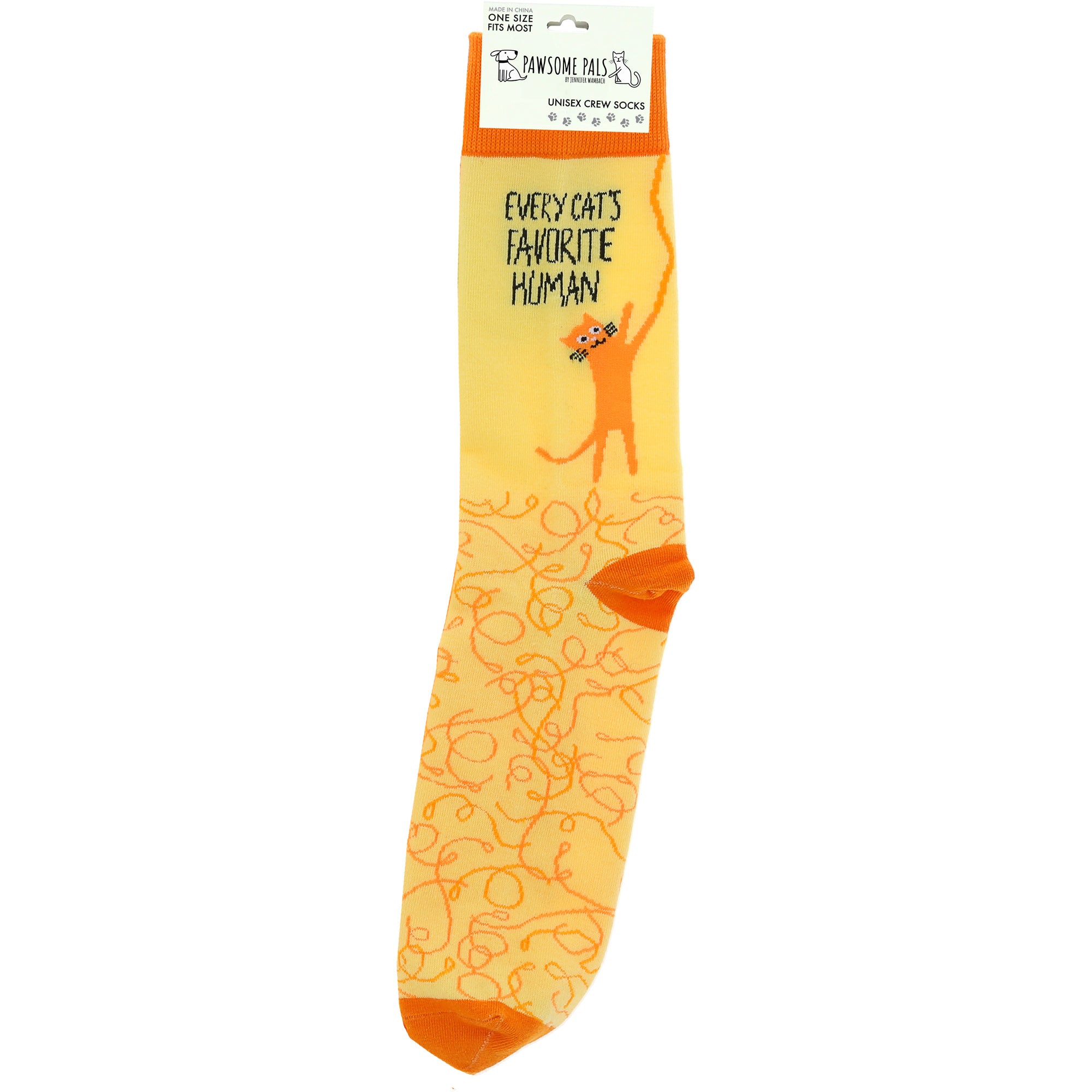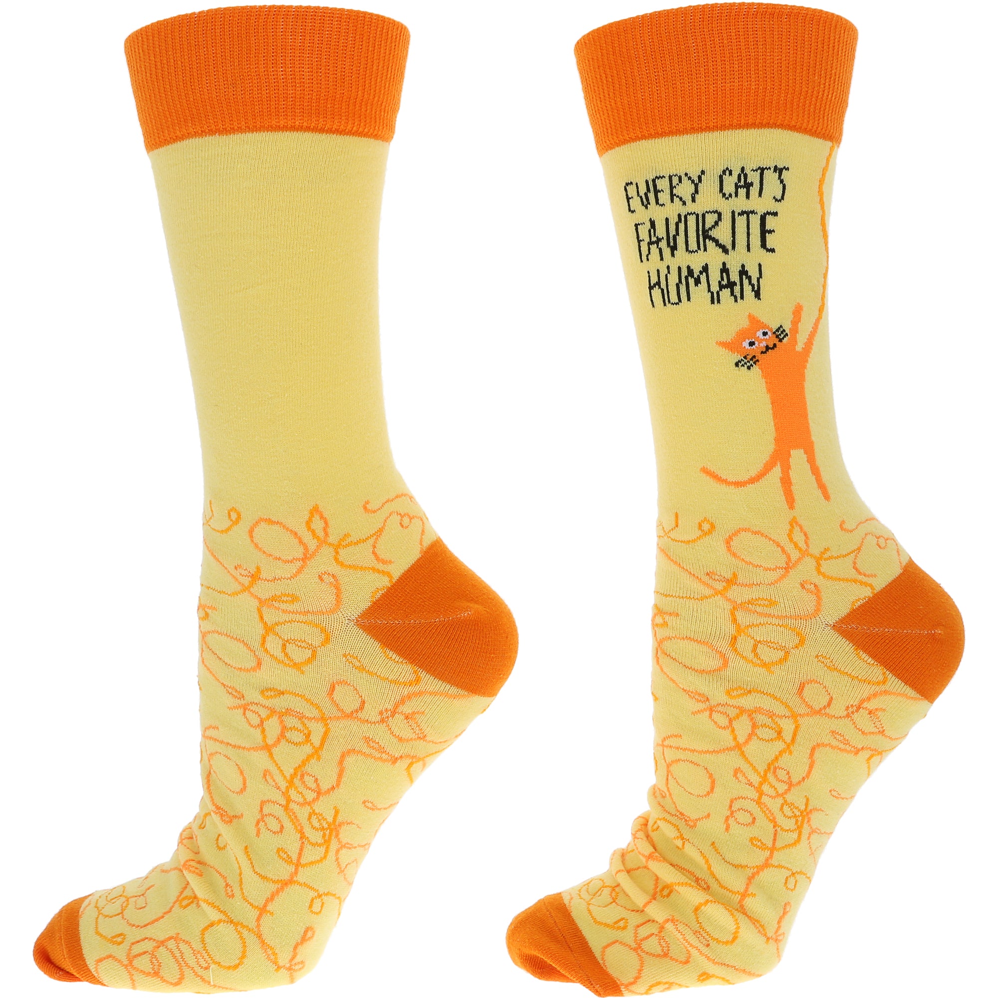 - IN-HOUSE DESIGN: The yellow body has orange string patterns accompanied by a black "Every Cat's Favorite Human" sentiment on the outer ankle of each sock. The orange cat plays with a yarn string next to and below the wording. The ankle, heel, and toe are all orange.