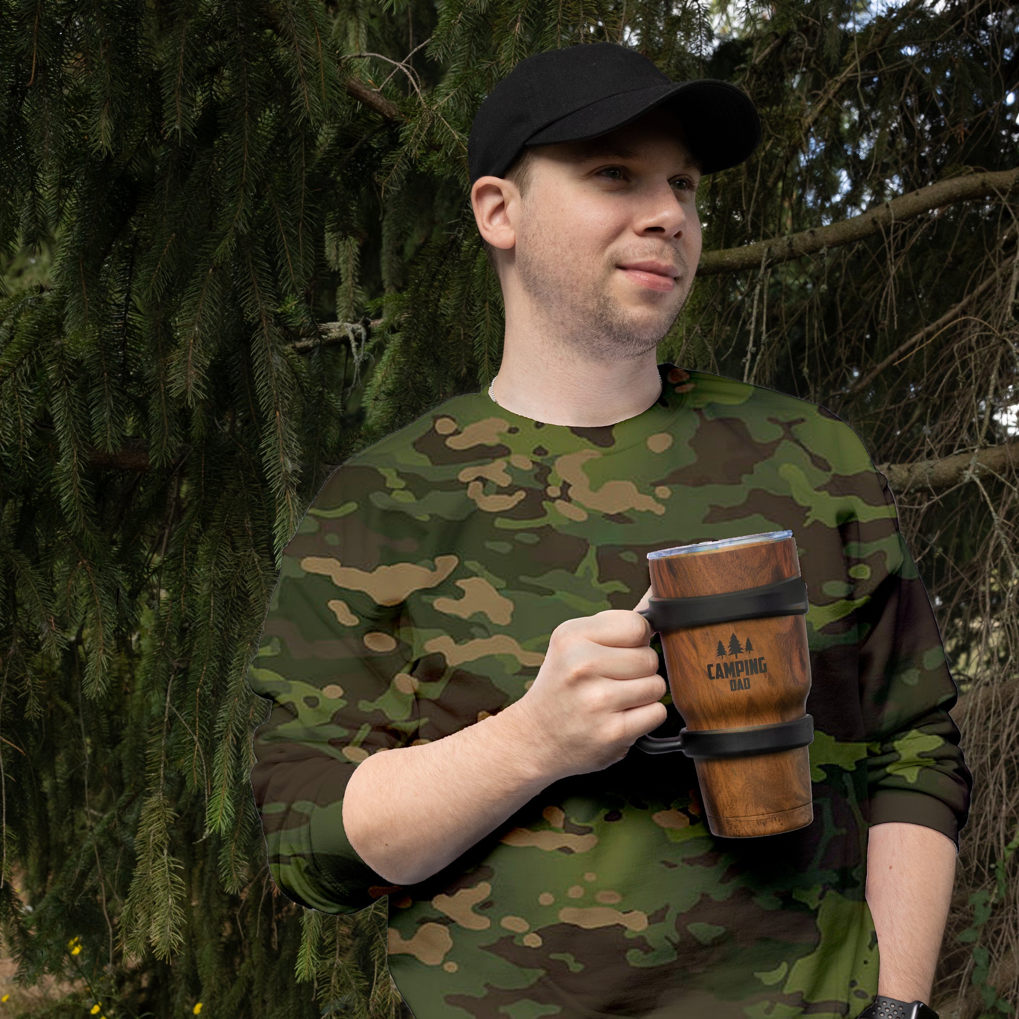 • IN-HOUSE DESIGN: The front side of the coffee, tea, and hot cocoa tumbler has a black glossy decal sentiment, "Camping Dad," along with some pine trees.