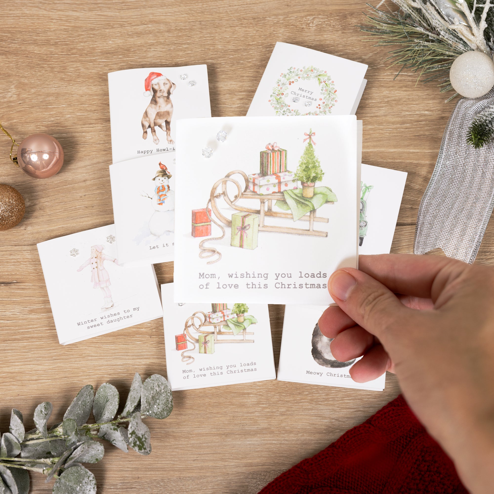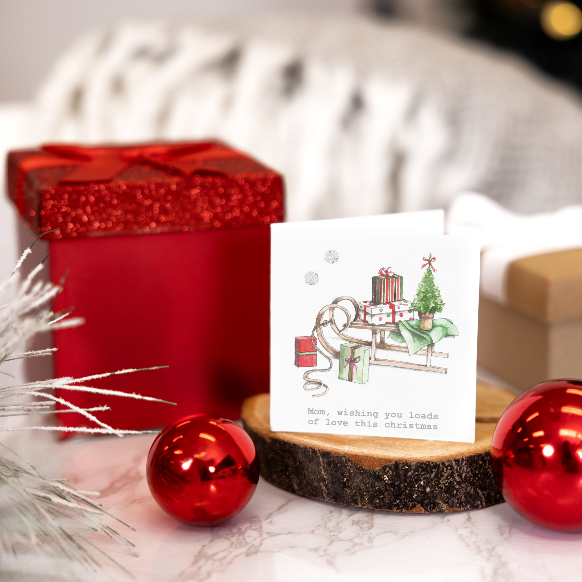 - IN-HOUSE DESIGN: The wooden sleigh with presents and a mini pine tree in a winter wonderland setting have the typewritten style gray "Mom, Wishing You Loads Of Love This Christmas" sentiment below, whereas the earring is placed in the upper left of the card.