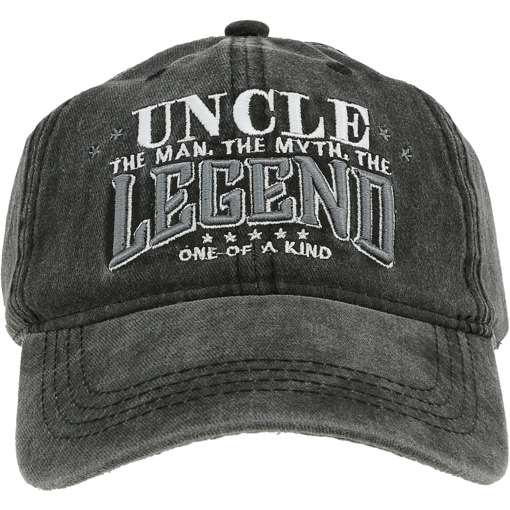 - PREMIUM QUALITY: Made from 100% cotton, this black washed adjustable hat offers a blend of comfort and style. It features the sentiment "Uncle: The Man, The Myth, The Legend" in white and gray embroidery.
