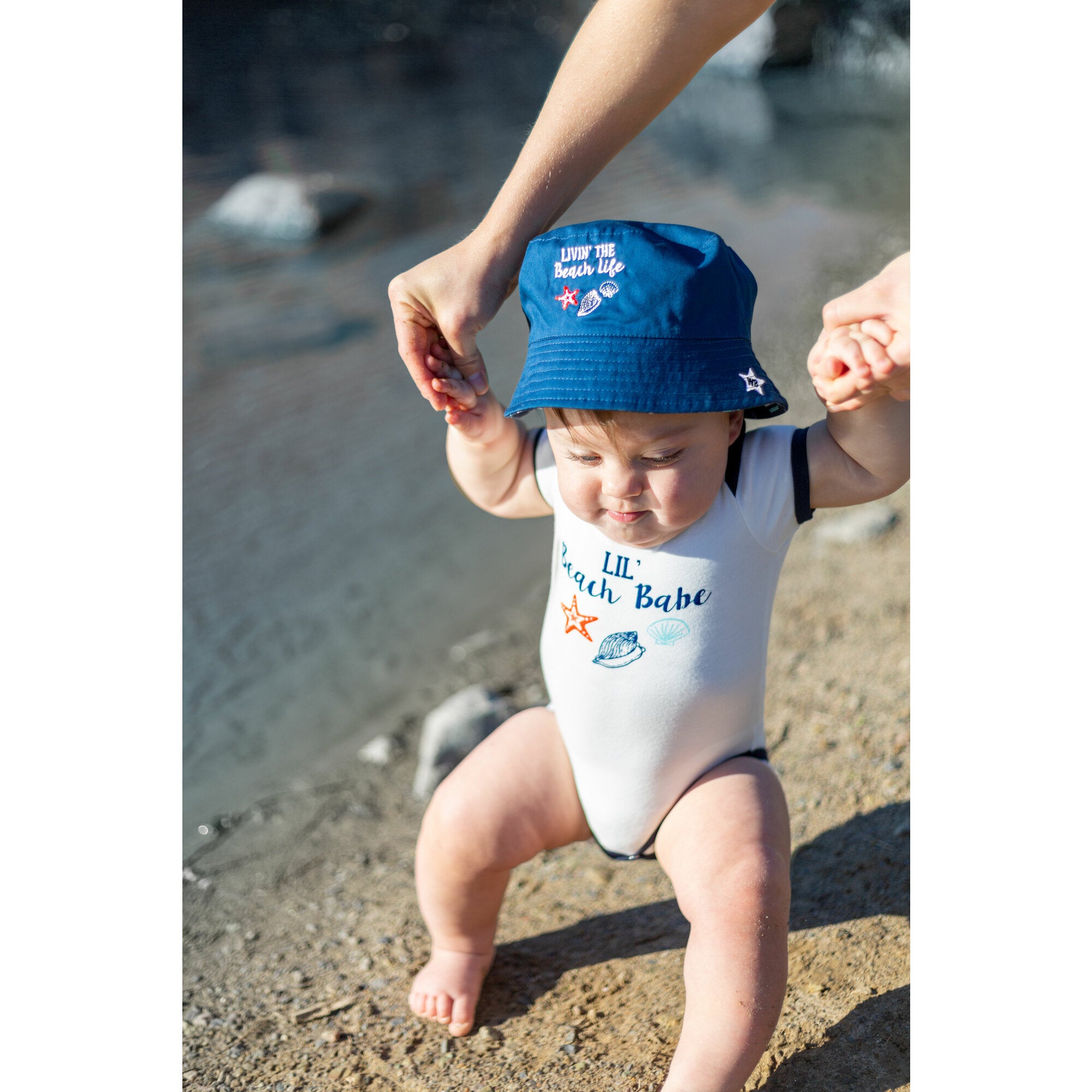 - IN-HOUSE DESIGN: "Lil' Beach Babe" text and accompanying seashell icons are printed onto the front of the bodysuit.