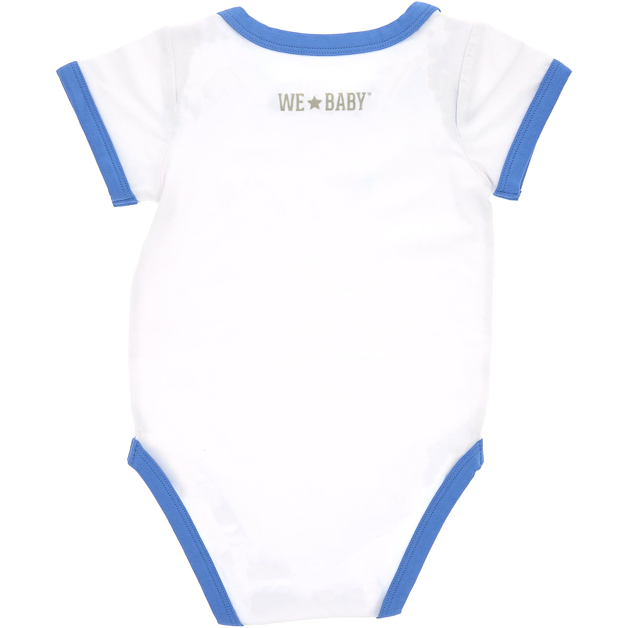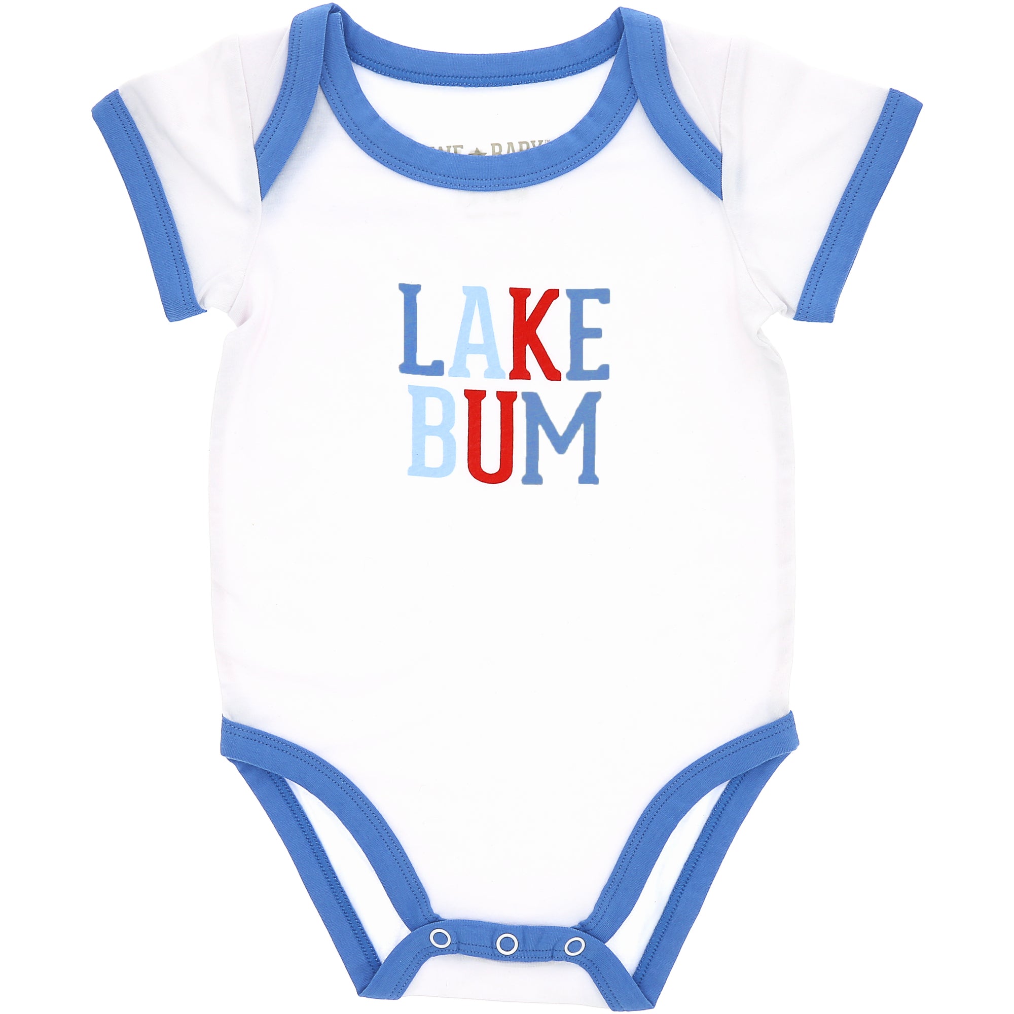 - IN-HOUSE DESIGN: Blue trimmed edges surround the neck, arms, and thighs. The light blue, dark blue, and red "Lake Bum" screen-printed sentiment is on the front center of the bodysuit. Itch-free tagless sizing is printed on the interior collar. The center upper back features a light gray logo.