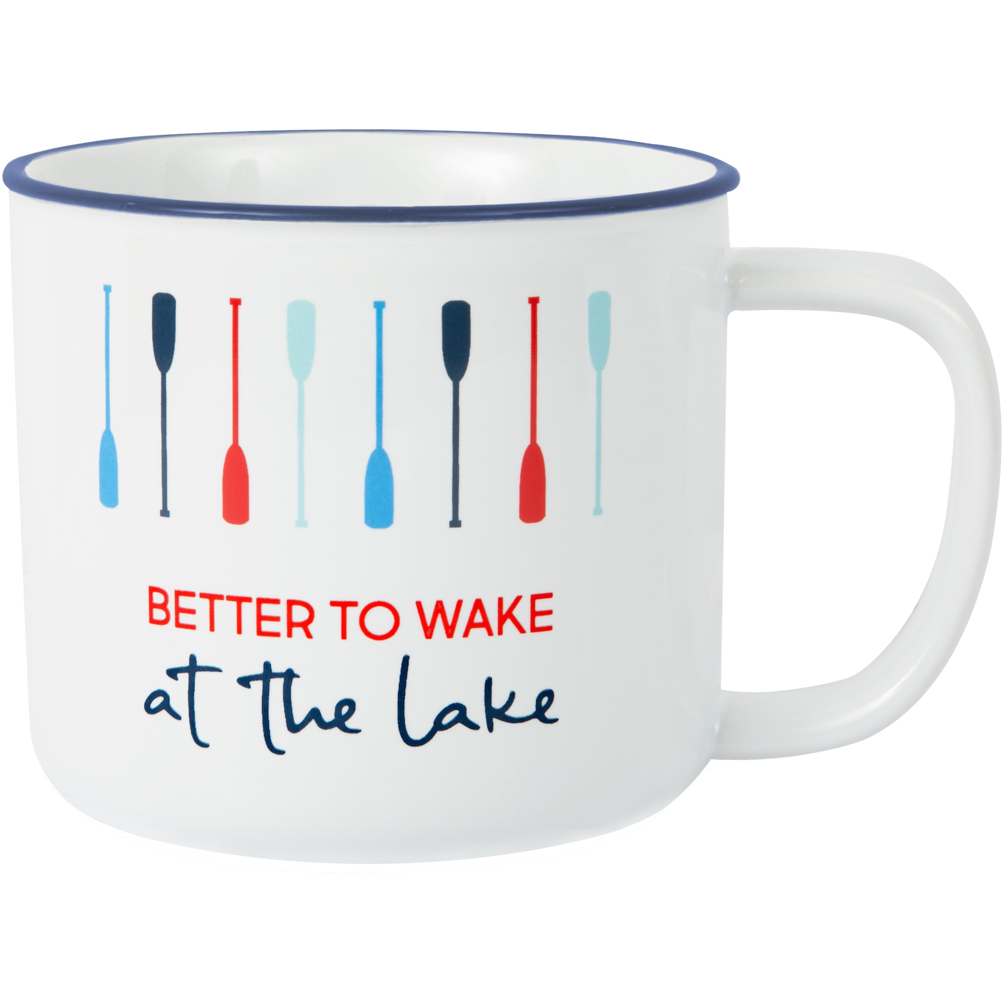 • IN-HOUSE DESIGN: Glossy "Better To Wake At The Lake" text and oar pattern image are heat-printed onto the front of the mug.