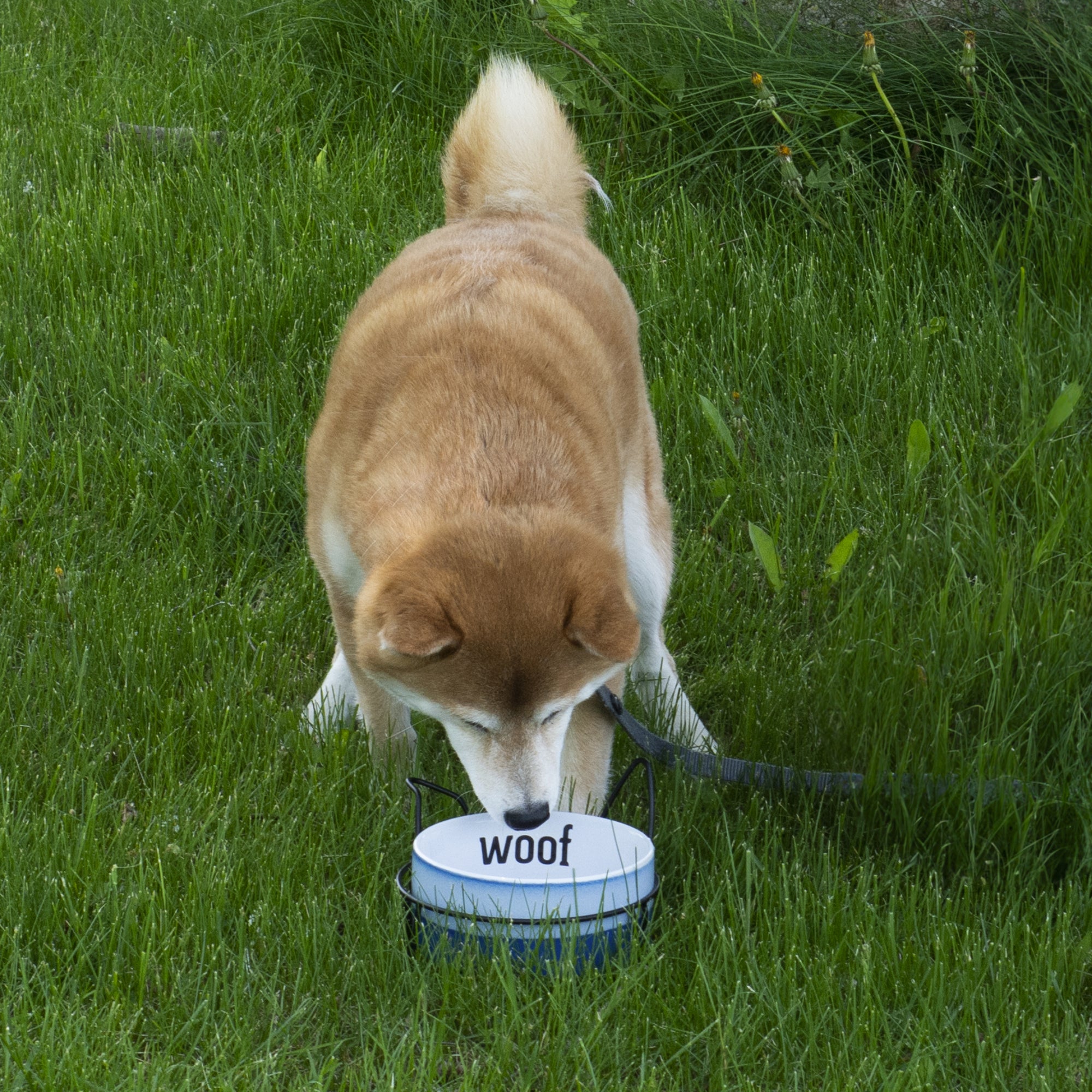 - IN-HOUSE DESIGN: The glossy finish bowl has a black dog face with eyes, a nose, and a tongue hanging from the mouth. The metal framing has two silhouetted dog ears, one flopping and one straight up. The interior brim of the bowl has a "woof" sentiment in black.