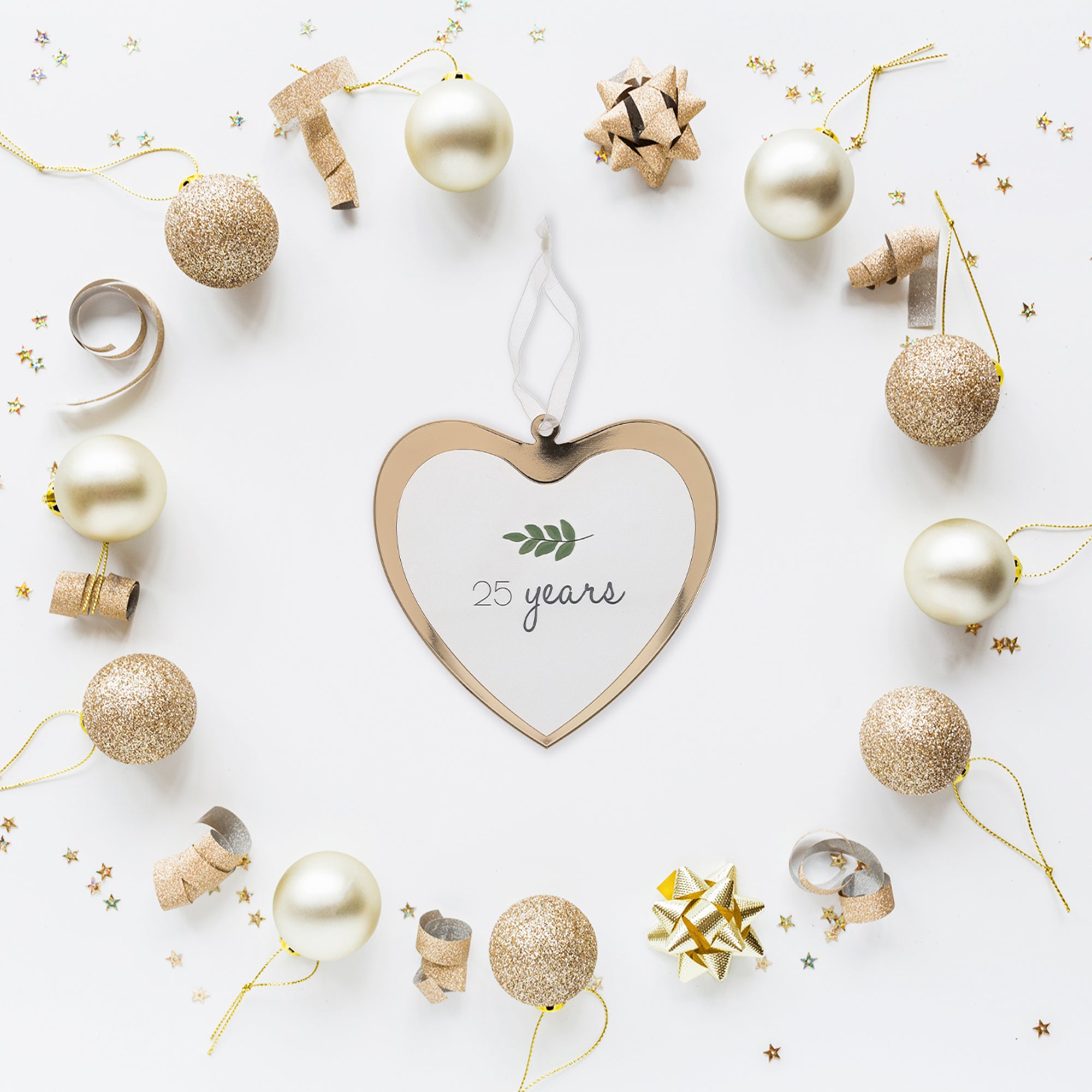 • IN-HOUSE DESIGN: Some greenery leaves are accompanied by the heartfelt wedding anniversary sentiment "25 Years" elegantly placed onto the centerpiece of the ornament.