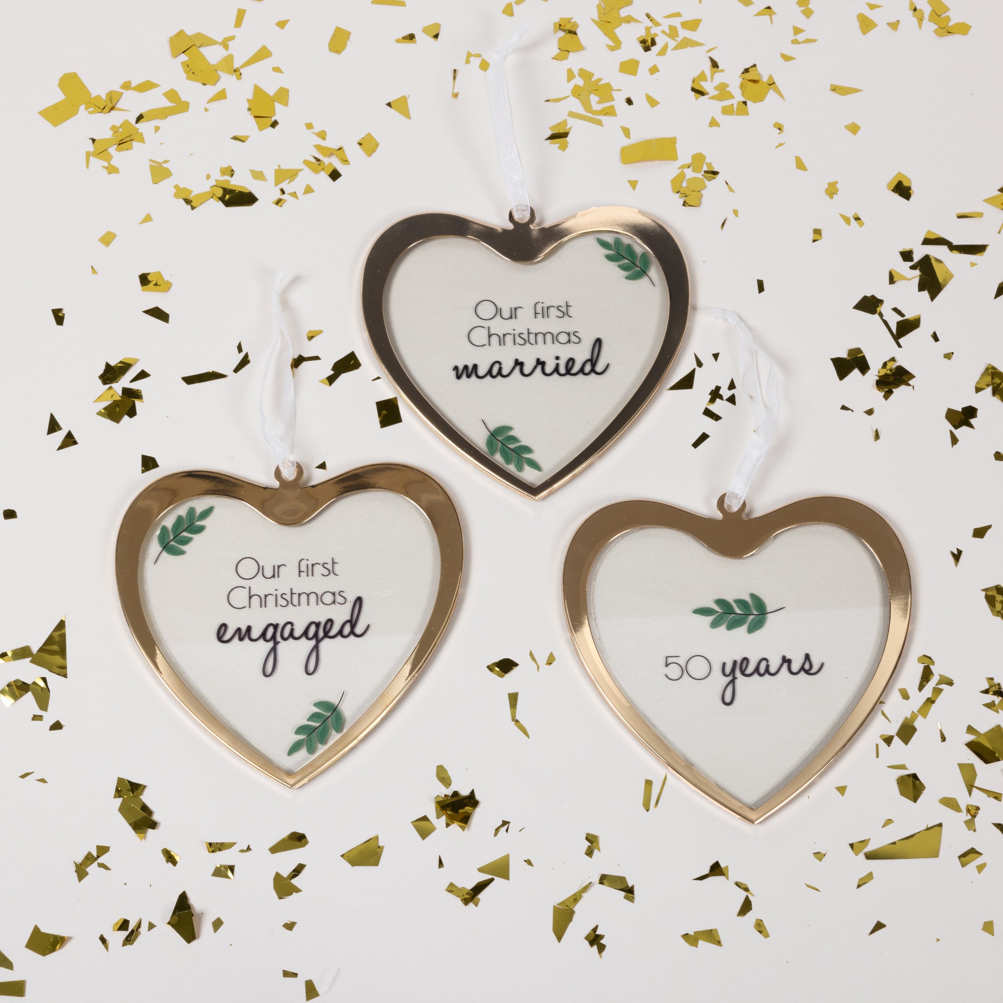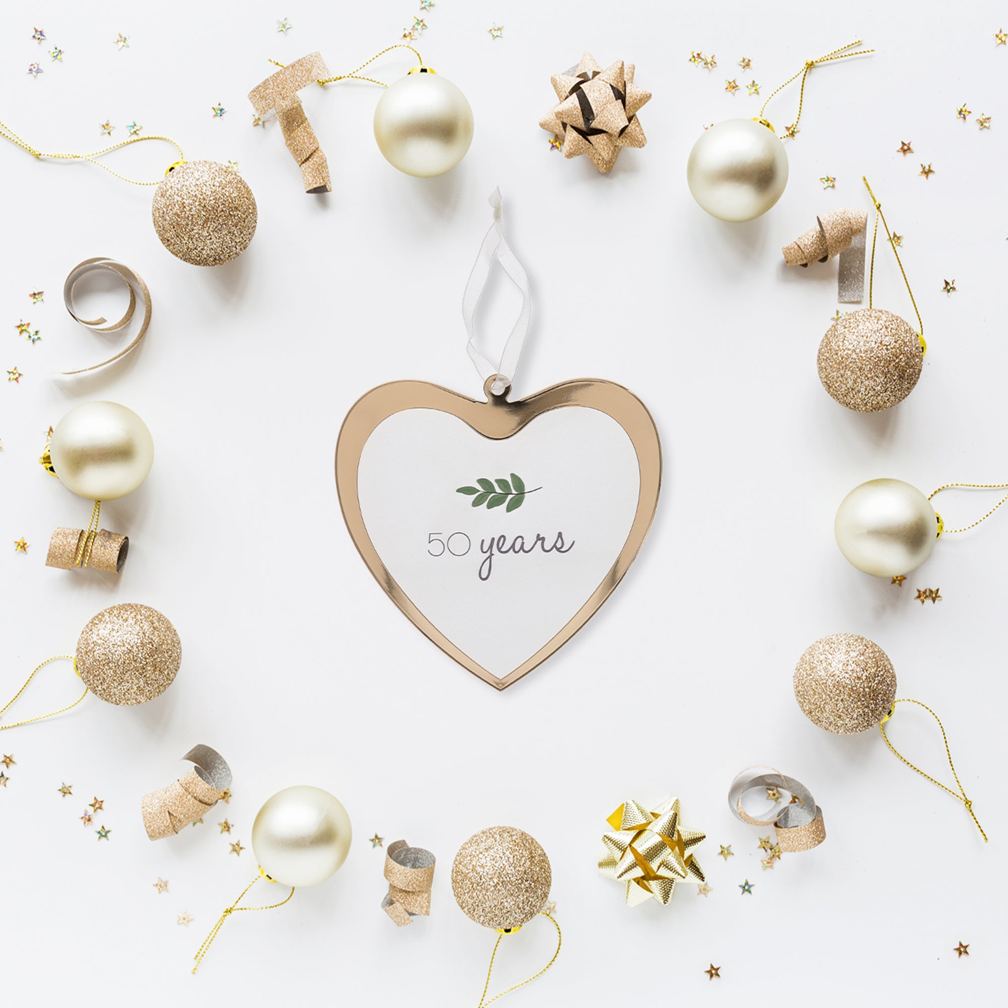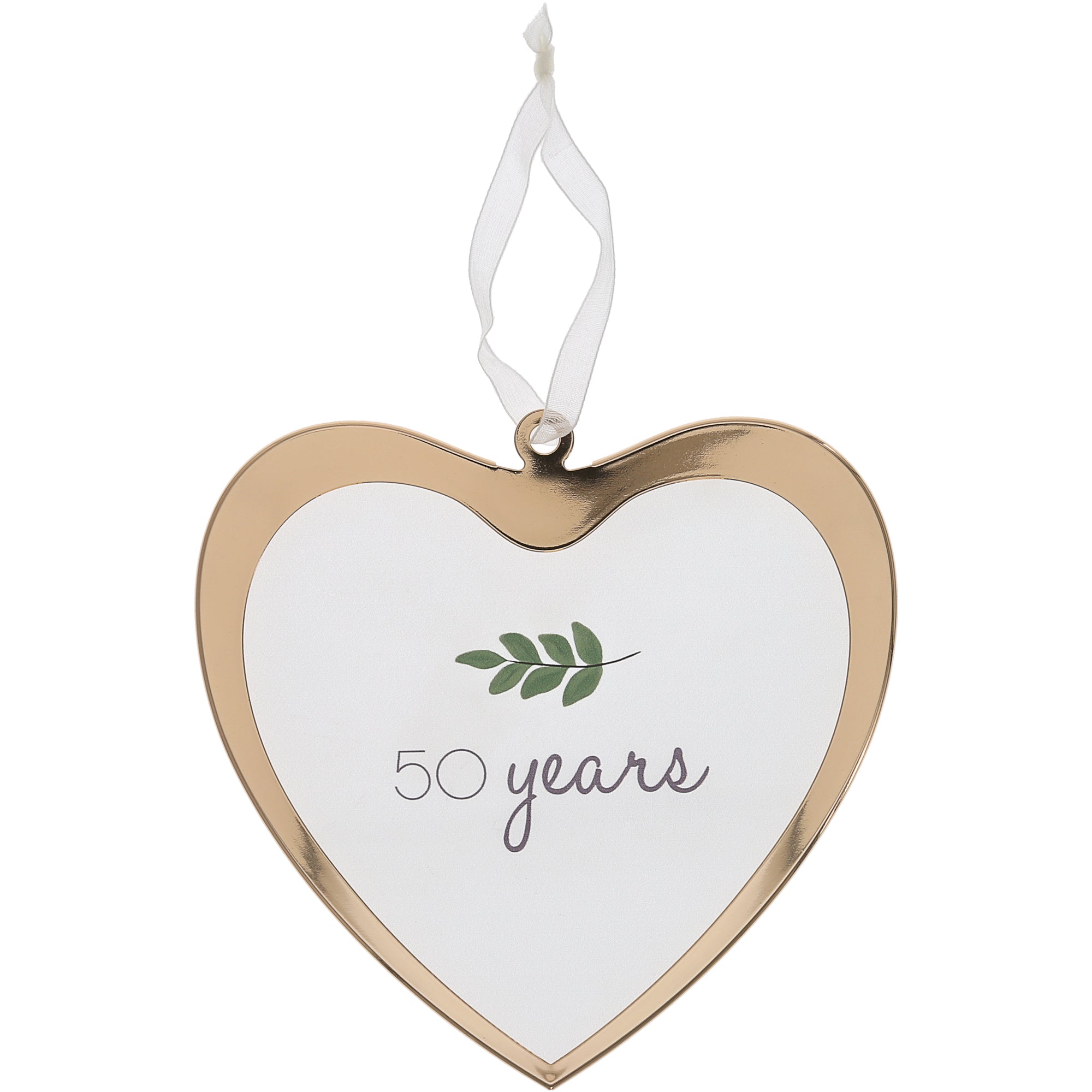• IN-HOUSE DESIGN: Some greenery leaves are accompanied by the heartfelt wedding anniversary sentiment "50 Years" elegantly placed onto the centerpiece of the ornament.