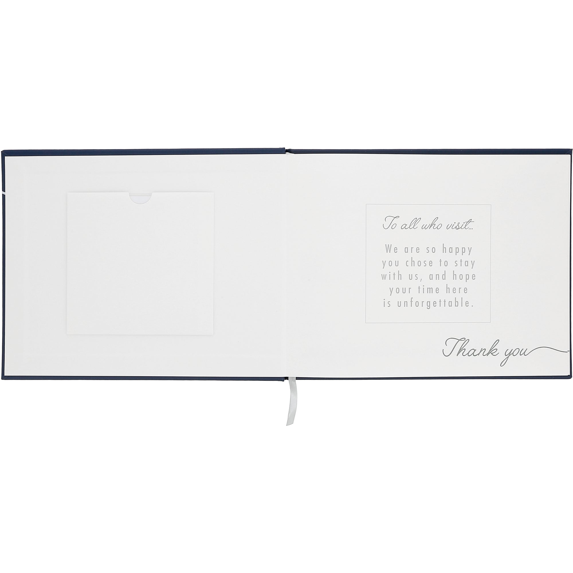 - PREMIUM QUALITY: This 9" x 7" hardcover guest book features a PU leather-paper cover with embossed glossy heat-stamp artwork and metallic foil accents for an elevated, high-quality finish. Includes 60 pages of 1-color printed paper with smooth writing texture. A satin ribbon bookmark keeps your place, and the interior pocket holds the included 4.25" x 4.25" photo insert or other keepsakes.