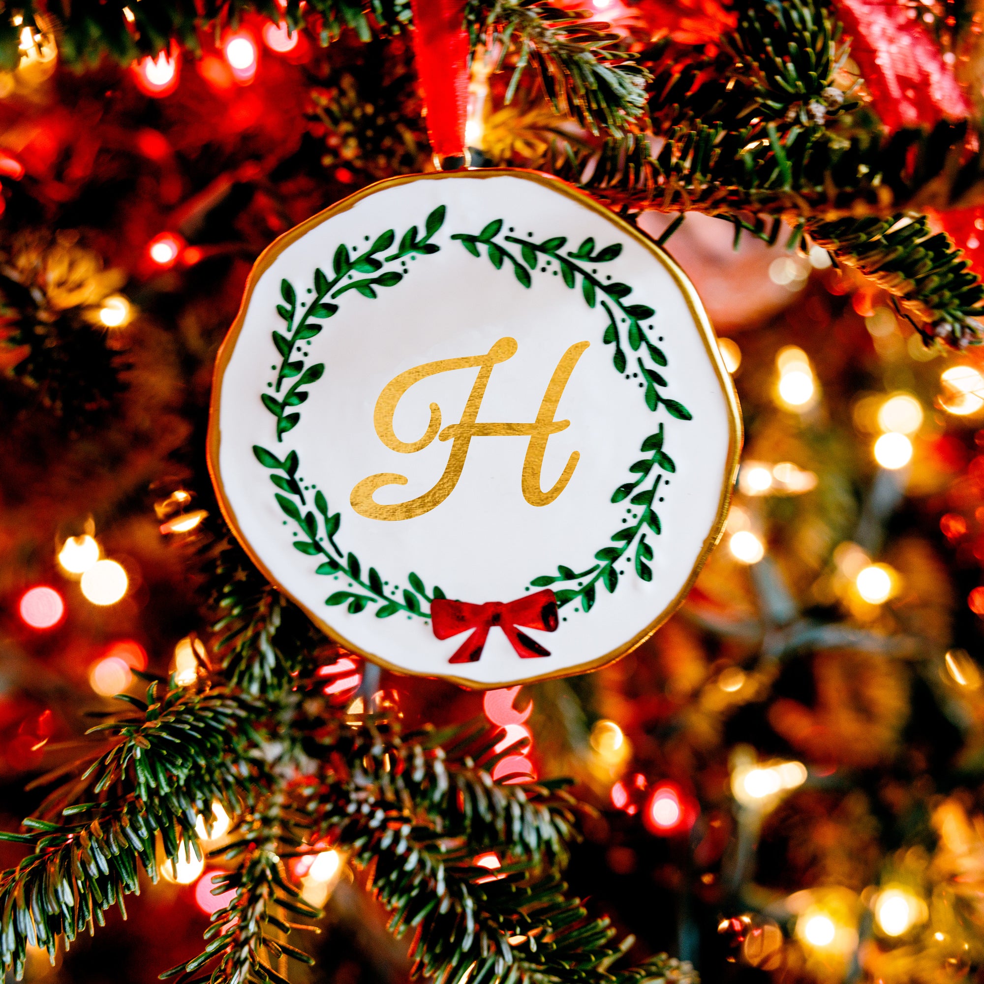 - PREMIUM QUALITY: Organic-shaped 4" round porcelain ornament has a removable red velvet ribbon for hanging. Packaged in a holiday striped background, an acetate-covered cardboard box with a gold bow-tie stretchy ribbon makes this a beautiful gift for the holiday season.