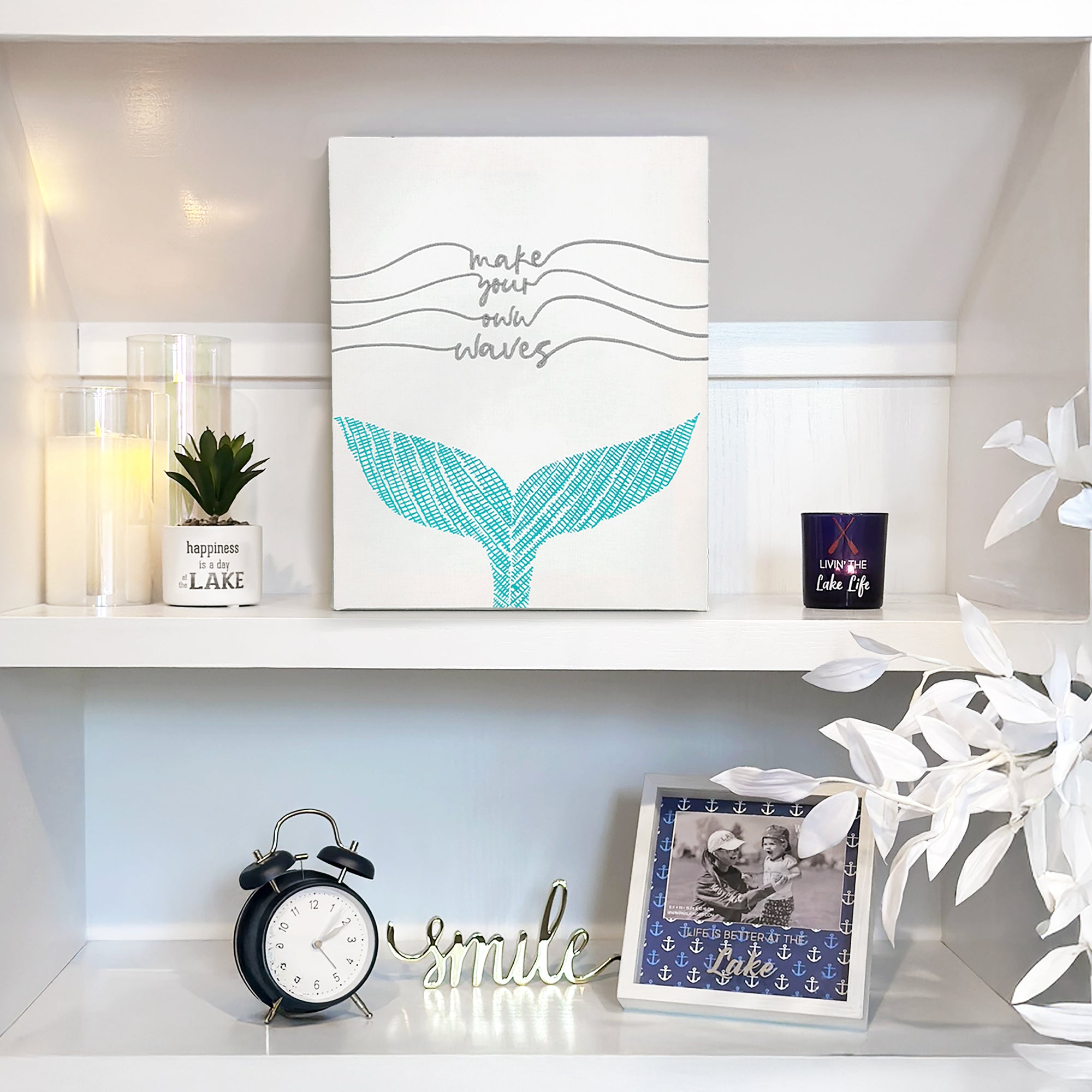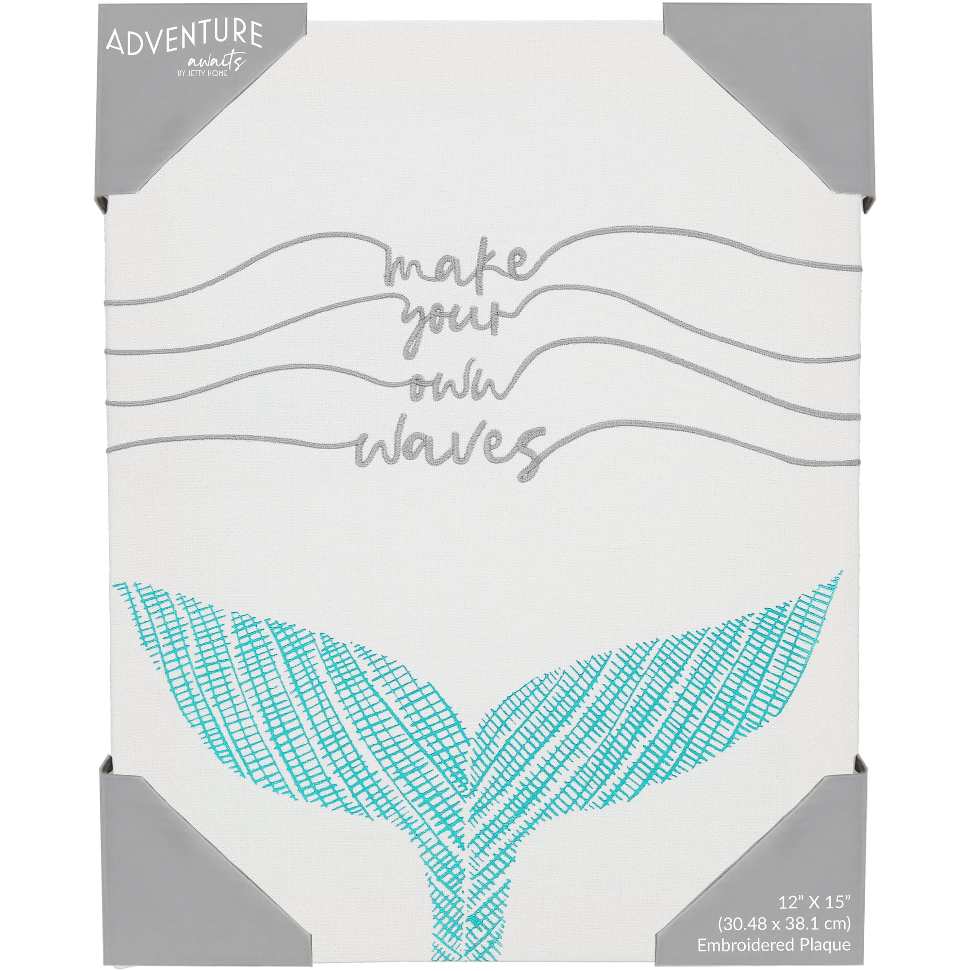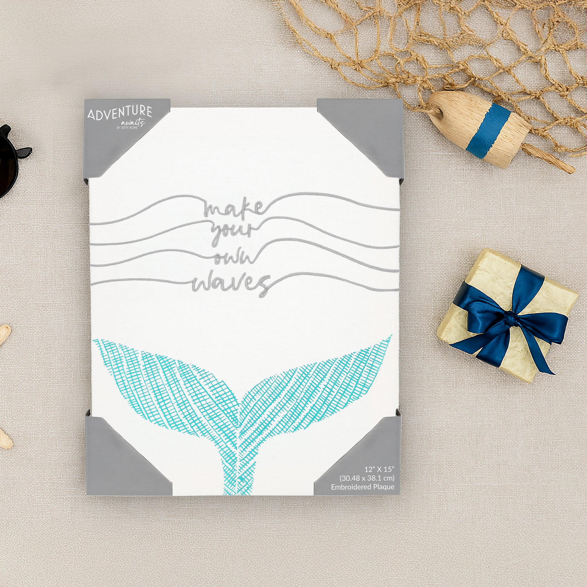 • IN-HOUSE DESIGN: The Make Waves Embroidered Plaque boasts a beautifully detailed embroidered whale tail, symbolizing freedom, strength, and the beauty of the ocean. The bright teal stitching contrasts beautifully with the crisp white fabric, while the scripted "Make Your Own Waves" text adds an uplifting and motivational touch. Perfect for those who love the sea and embrace life’s adventures.