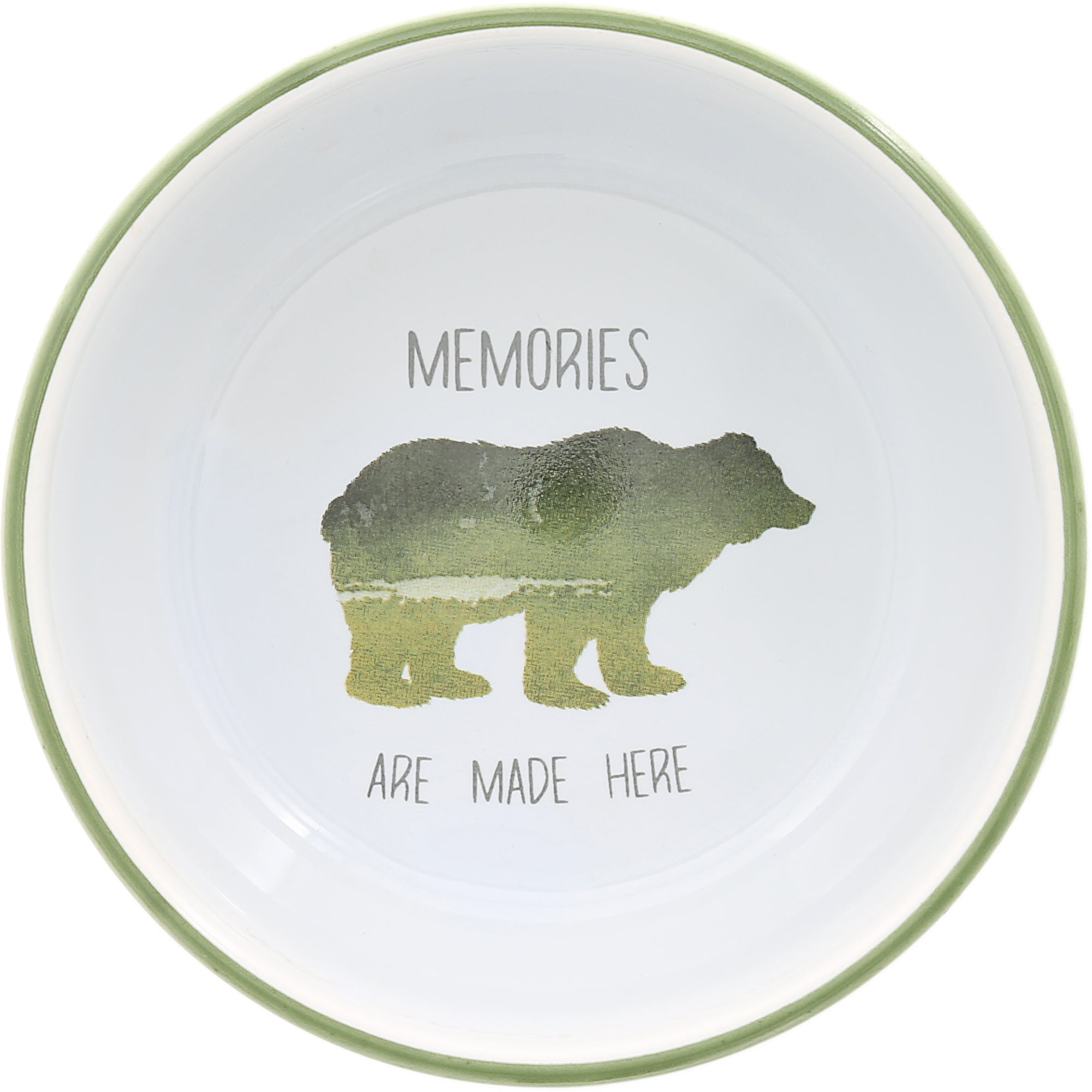 • IN-HOUSE DESIGN: The bowl's brim is green, and its exterior has birchwood-like gray watercolor stripes. The bottom of the bowl has a green ombre bear silhouette with a "Memories Are Made Here" sentiment. The small light wood spoon fits comfortably into anyone's hand.