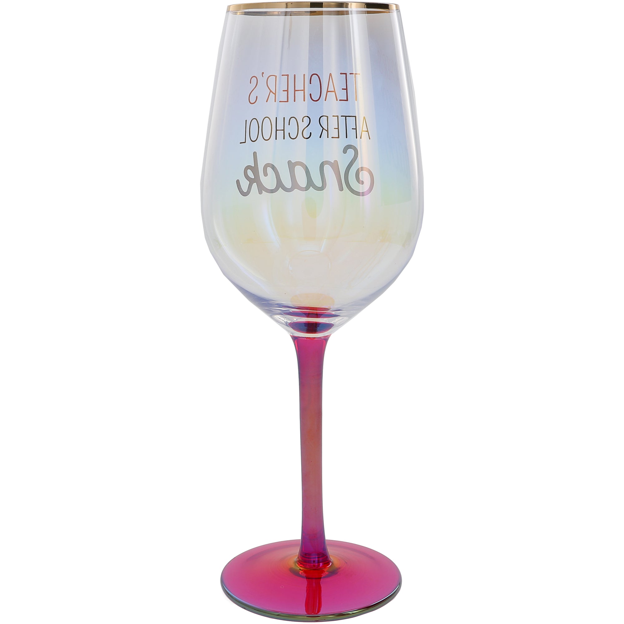- IN-HOUSE DESIGN: "Teacher's After School Snack" black, red, and gold sentiment is placed on the front of the drinkware. The brim of the glass is metallic gold.