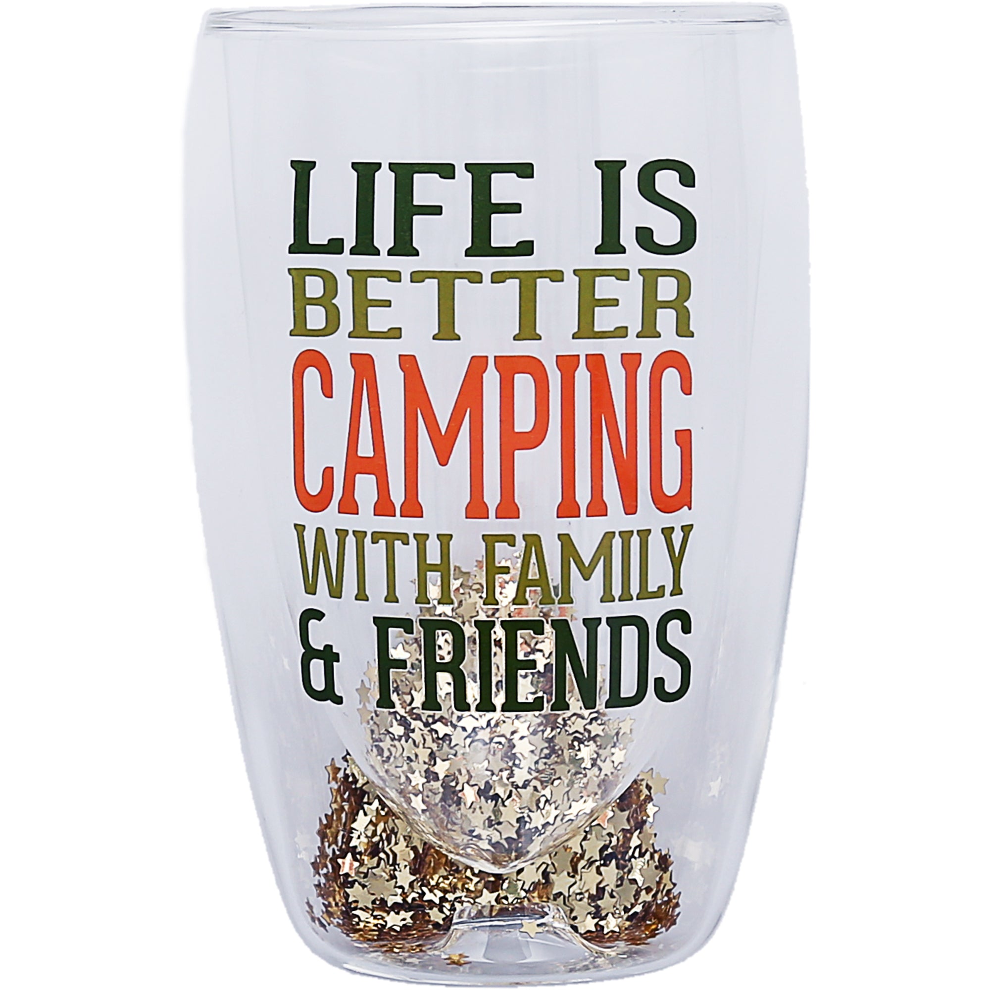 - IN-HOUSE DESIGN: The front of the glass has an orange and two tones of green sentiment, "Life Is Better Camping With Family & Friends," in bold capital fonts.