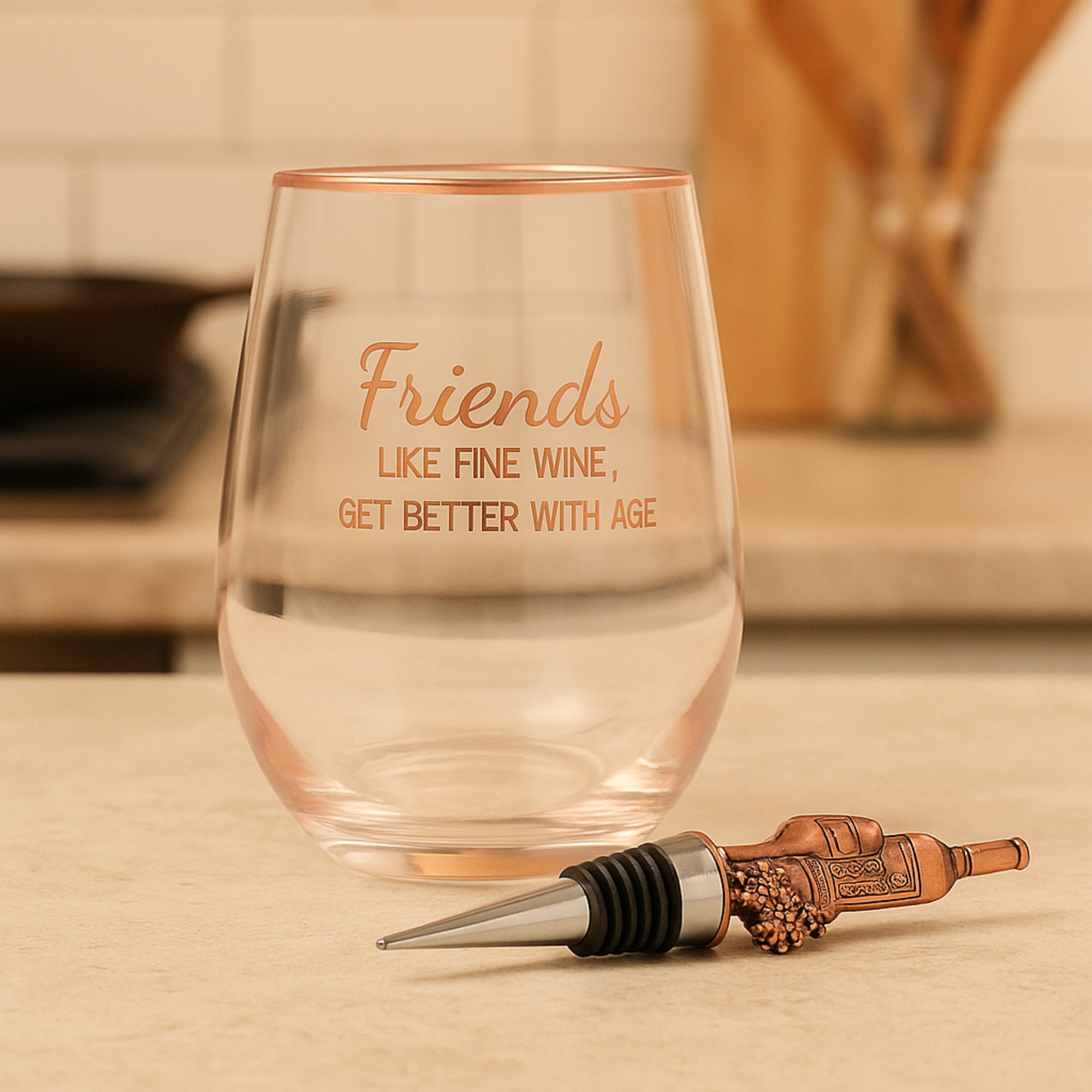 - IN-HOUSE DESIGN: The rose gold "Friends Like Fine Wine, Get Better With Age" sentiment encompasses the front of the stemless wine glass. The topper has a textured, detailed front side and is silver, rose gold & black. Friendships that last a lifetime are amazing; gift this to your BFF and best friend to show them how special they are.