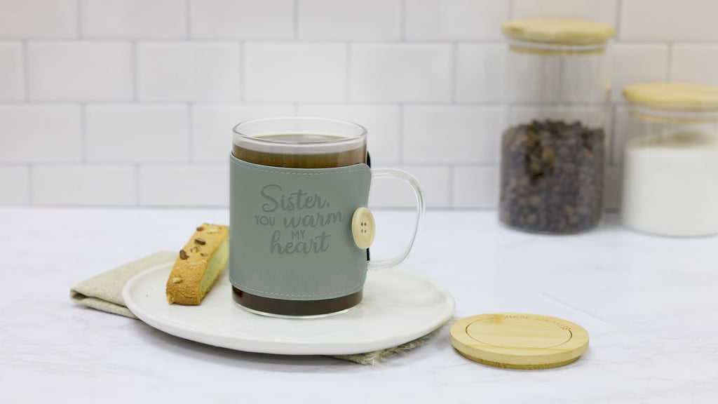 - IN-HOUSE DESIGN: Embrace the warmth of appreciation with this heartwarming drinkware adorned with a charming green wrap. The wrap bears the loving sentiment "Sister, You Warm My Heart," exquisitely engraved, complemented by delicate green stitching, a tan button, and a white elastic closure for a touch of elegance. Meanwhile, the coaster cap crafted from natural wood grain showcases a rounded "Share Kindness" text encircled by a circular line, radiating positivity with every sip.