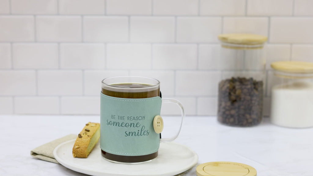 - IN-HOUSE DESIGN: Embrace the warmth of appreciation with this heartwarming drinkware adorned with a charming green wrap. The wrap bears the loving sentiment "Be The Reason Someone Smiles," exquisitely engraved, complemented by delicate green stitching, a tan button, and a white elastic closure for a touch of elegance. Meanwhile, the coaster cap crafted from natural wood grain showcases a rounded "Share Kindness" text encircled by a circular line, radiating positivity with every sip.