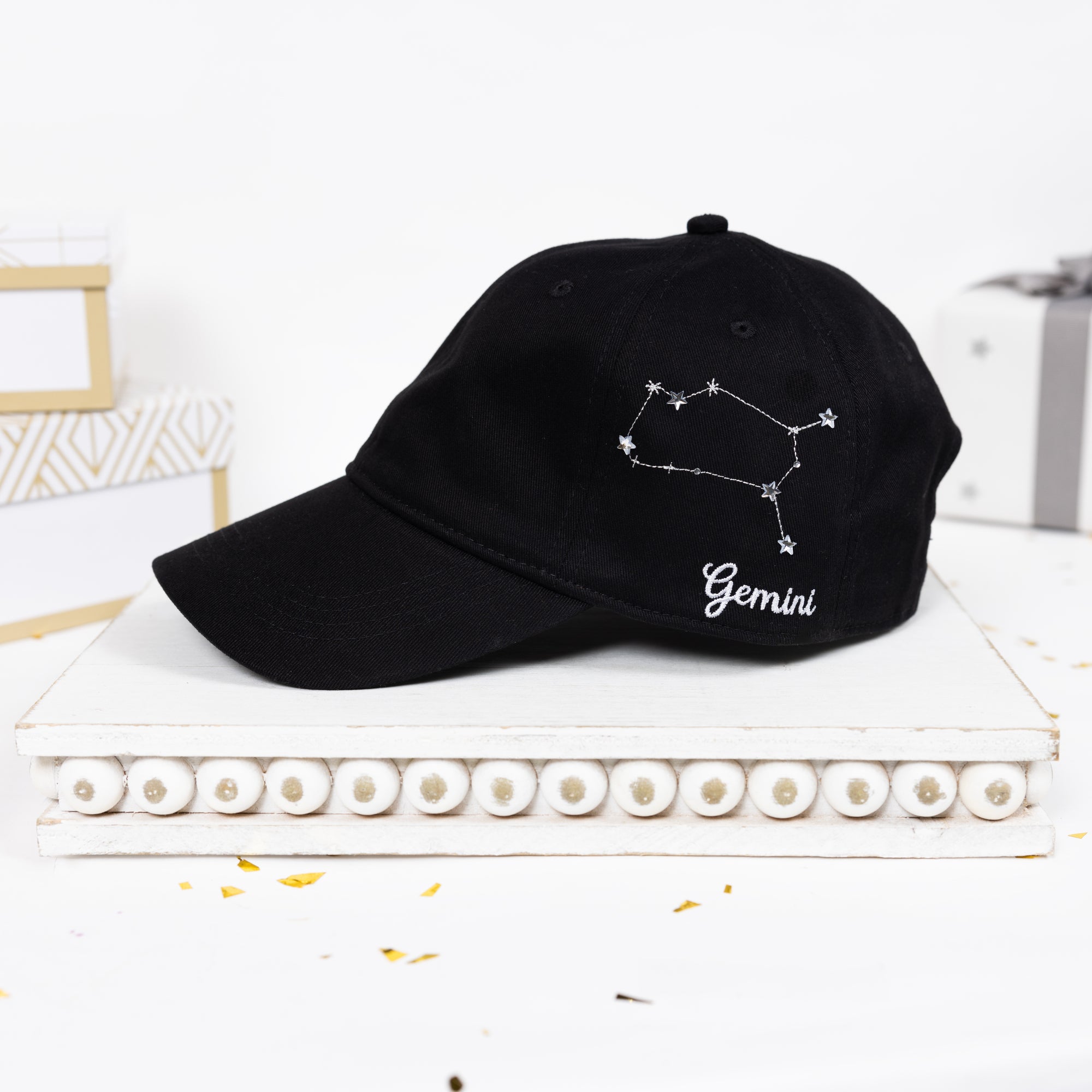 • IN-HOUSE DESIGN: The front of the black hat featured a white celestial birth sign embroidered in white. The right side of the hat features a white "Gemini" sentiment along with a zodiac constellation featuring stars and gem details also embroidered in white.