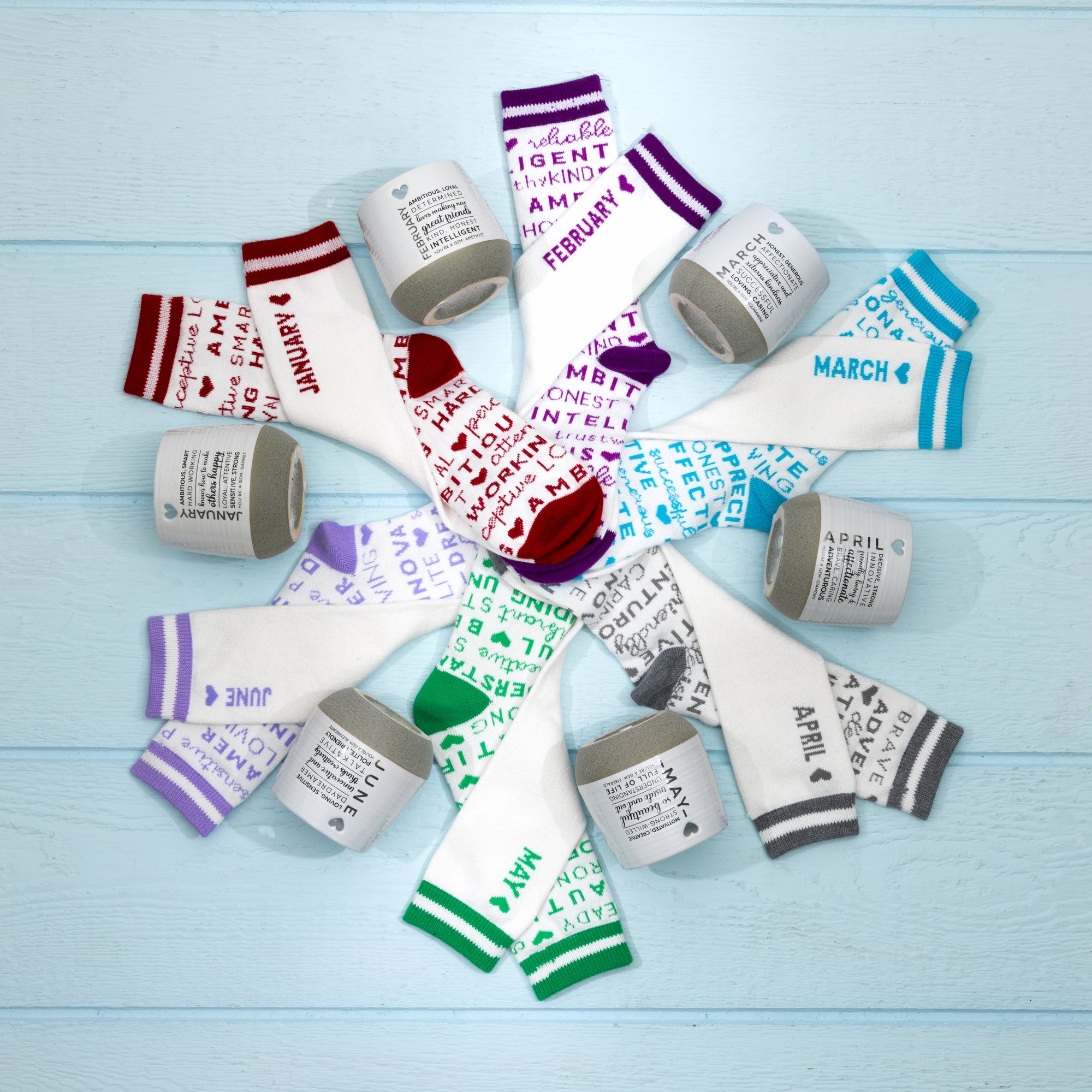 - IN-HOUSE DESIGN: Showcasing a bold "January" print with a dynamic word splash pattern featuring traits like "Ambitious," "Smart," "Hard-Working," "Perceptive," and "Loyal," these socks are designed to represent the personality of those born in January. The bright red lettering contrasts beautifully against the white fabric, giving these socks a fun and stylish flair that reflects the wearer’s strong, determined spirit.