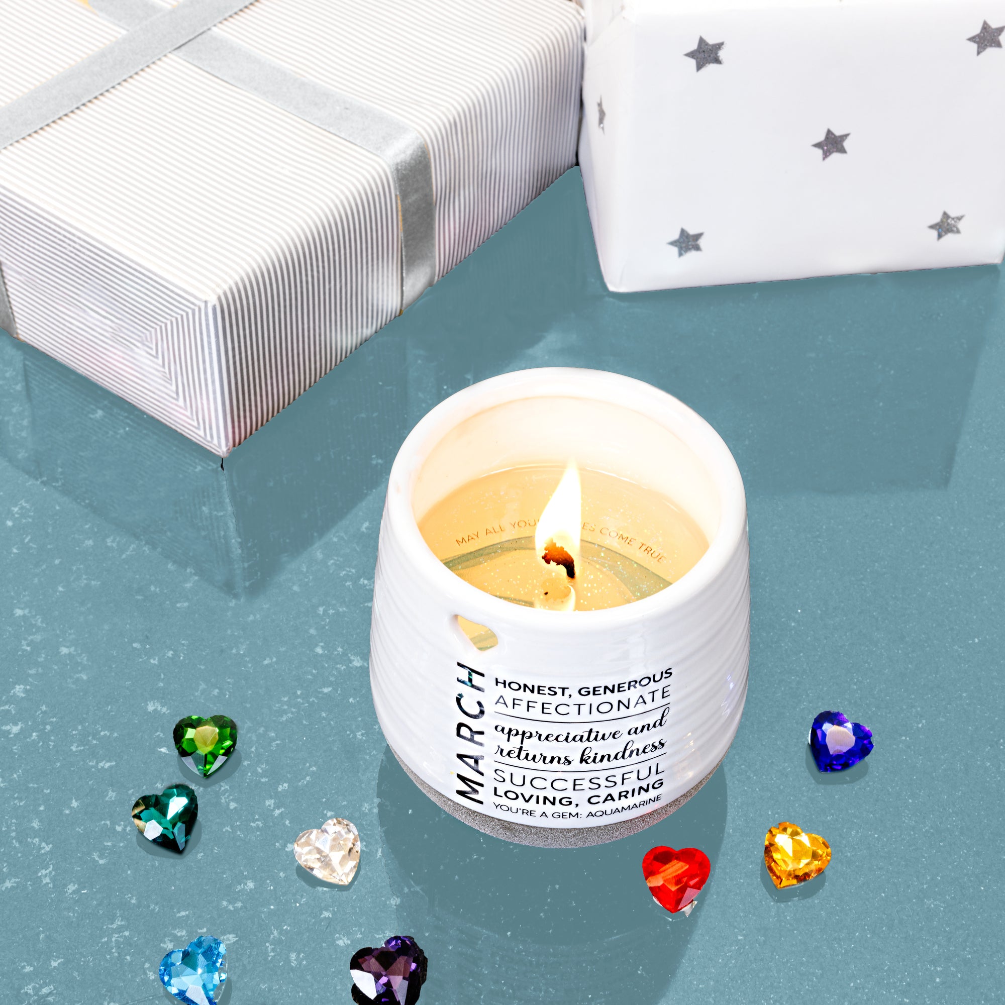 - IN-HOUSE DESIGN: Silver "March" sentiment lines the left side under the heart accompanied by black "Honest, Generous, Affectionate, Appreciates And Returns Kindness, Successful, Loving, Caring, You Are A Gem: Aquamarine" wording to the right, which is centered on the container. The heart inside is blue, and the wax reveals a flowy fabric-like blue image with "May All Your Wishes Come True" wording. The wax reveal begins to show after 10 minutes and is fully visible after 50 minutes of burn time. Overall burn time is 27-30 hours. Always remember to trim your wick down after each burn.