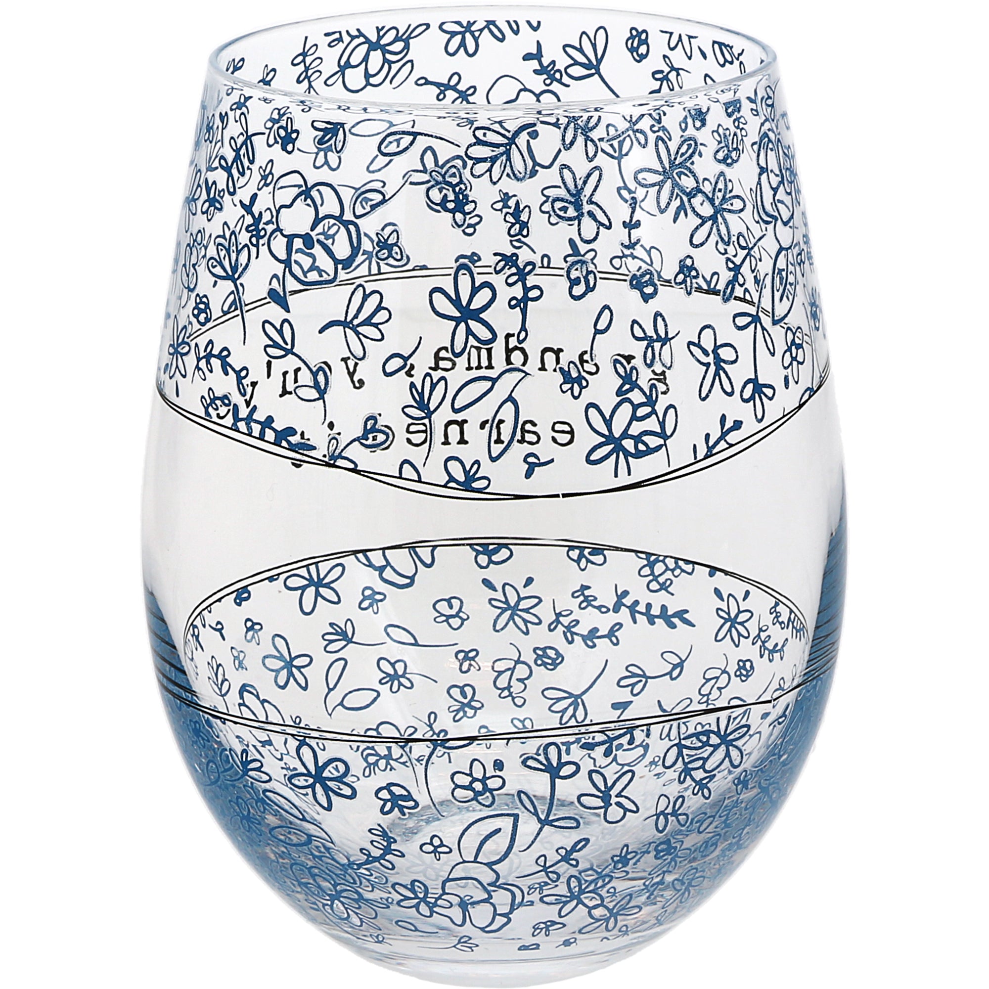 - IN-HOUSE DESIGN: The cobalt blue watercolor floral pattern is fully wrapped around the glass with an opening where the text decal is visible. "Grandma, you've earned it," text is applied to the front of the glass. The artwork was designed by artist AmyLee Weeks, who has always loved sheer, soft, and happy colors.