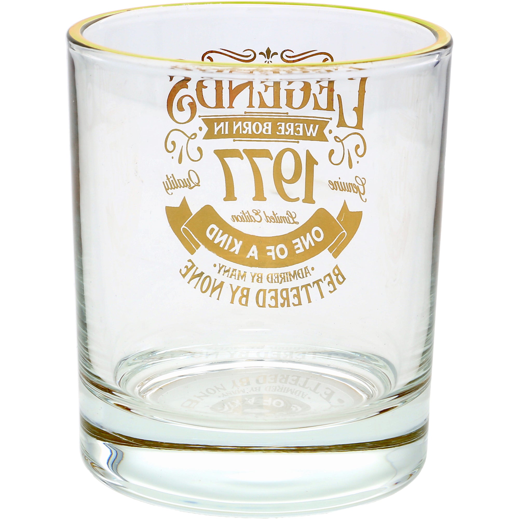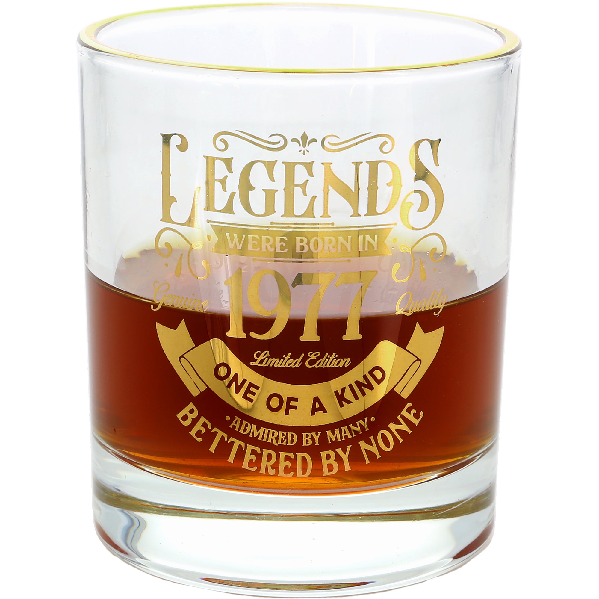 - IN-HOUSE DESIGN: The gold electroplated rim is accompanied by the gold "Legends Were Born In 1977, Genuine Quality, Limited Edition, One Of A Kind, Admired By Many, Bettered By None" sentiment decal on the front side of the whiskey along with banners and stars.