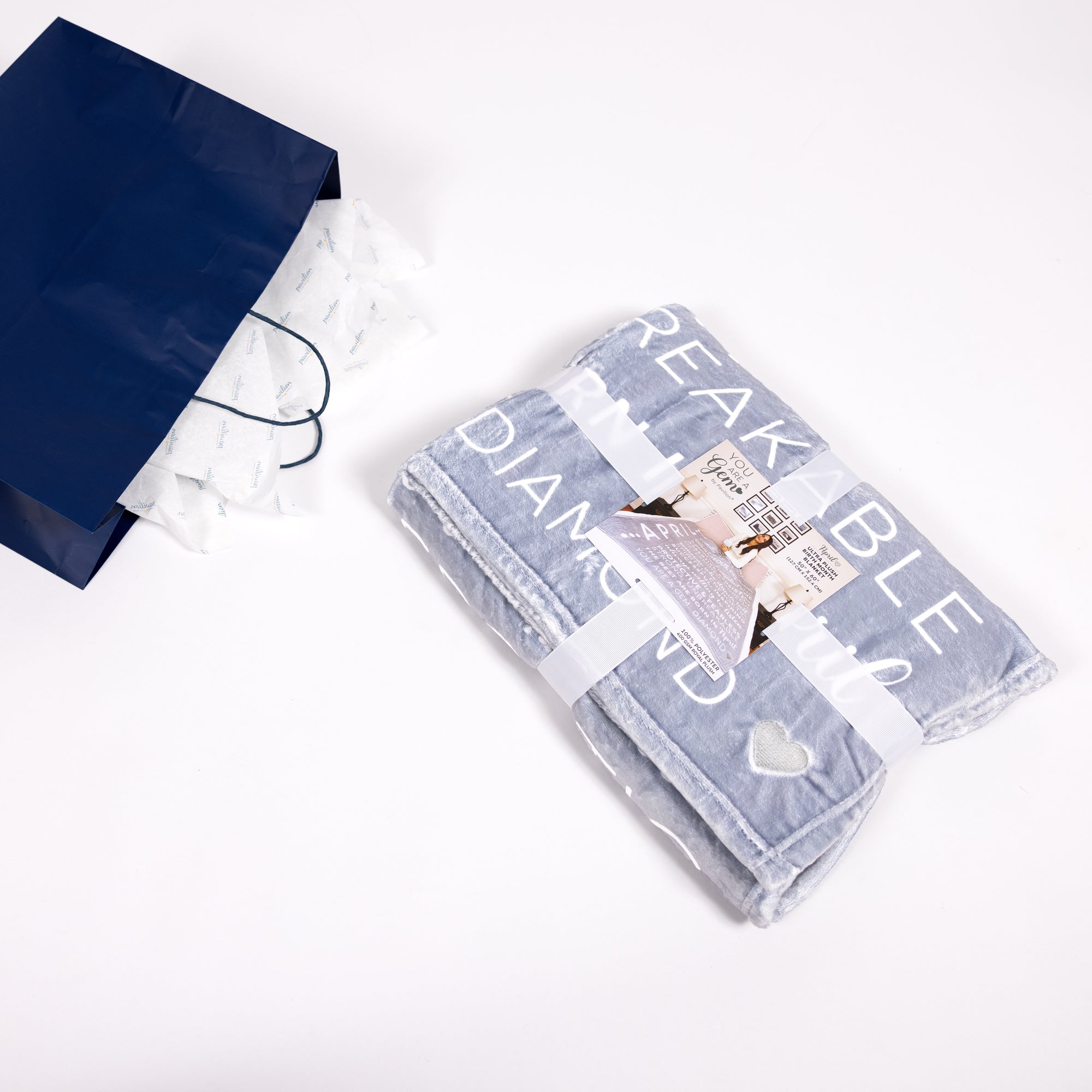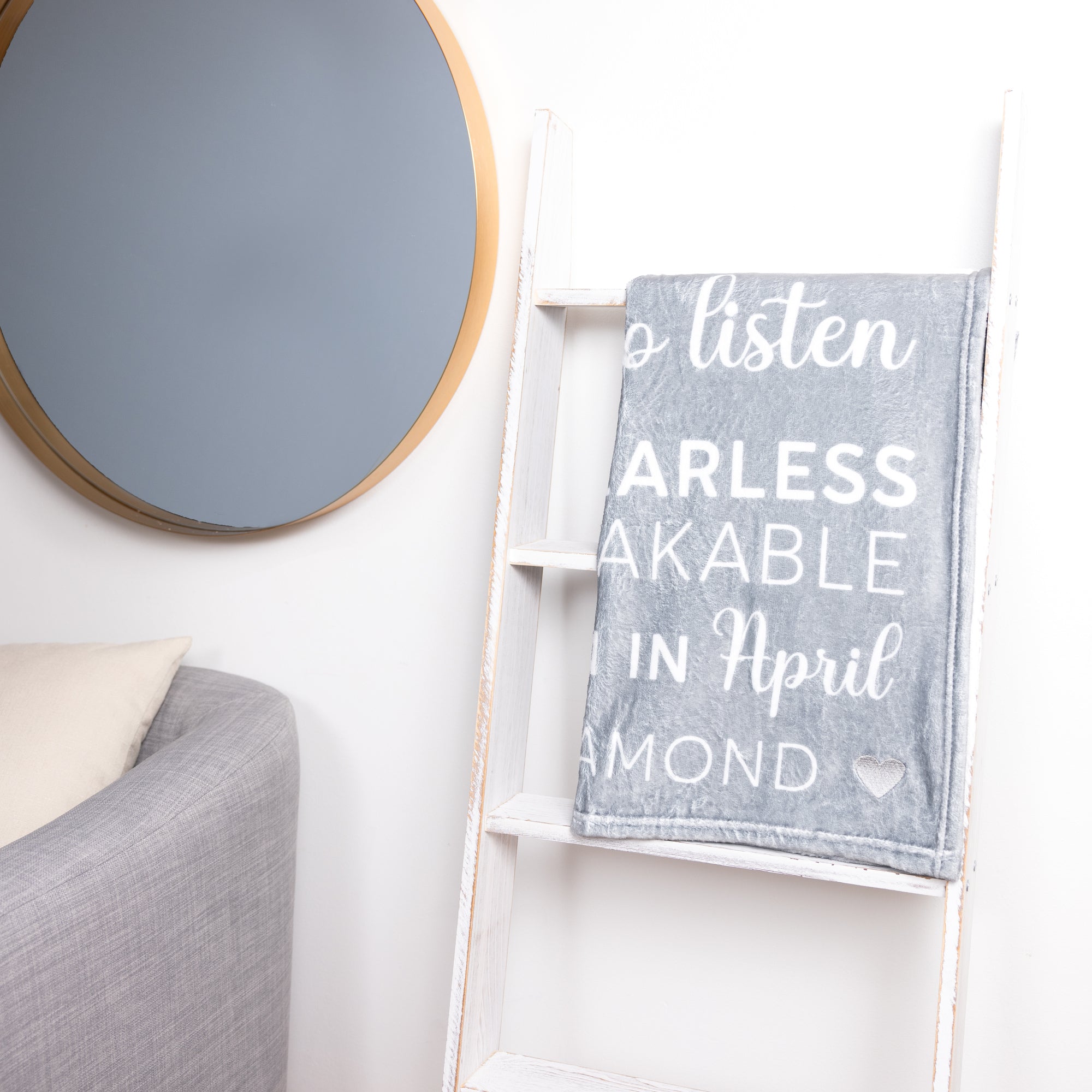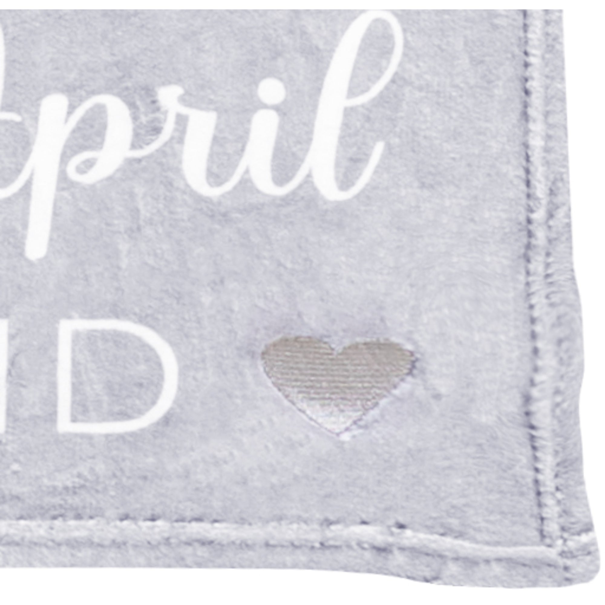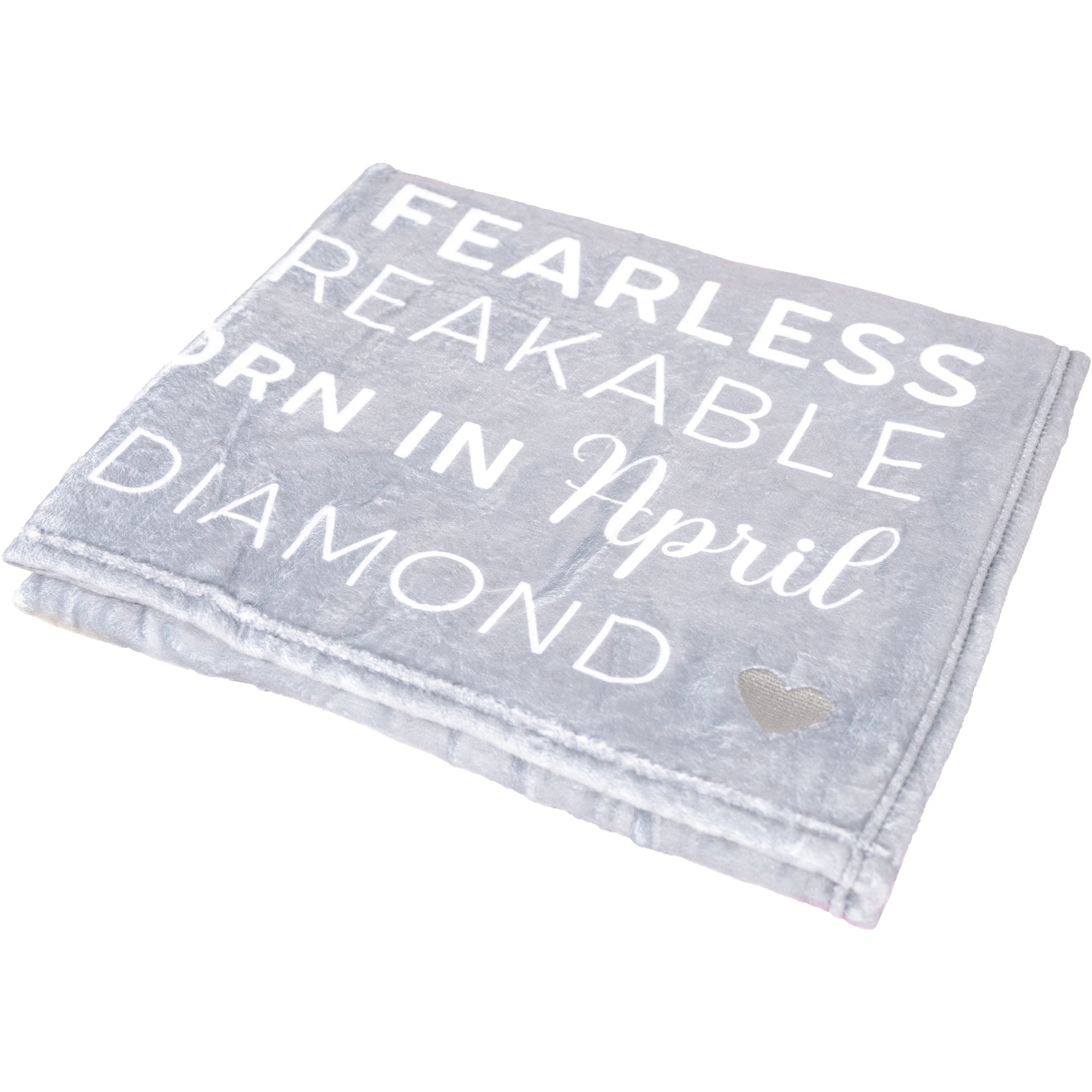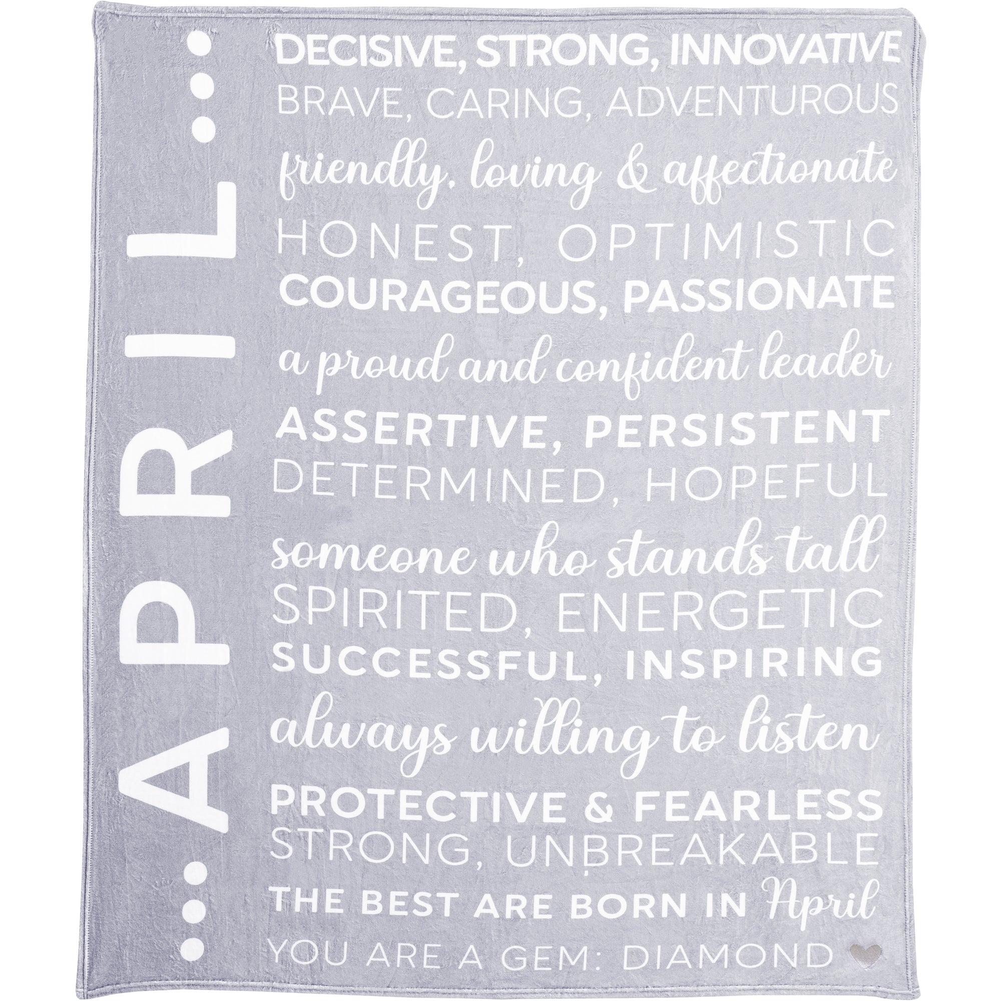 • IN-HOUSE DESIGN: The printed sentiment read "April" down the left side of the blanket along with an "Decisive, Strong, Innovative, Brave, Caring, Adventurous, Friendly, Loving & Affectionate, Honest, Optimistic, Courageous, Passionate, A Proud And Confident Leader, Assertive, Persistent, Determined, Hopeful, Someone Who Stands Tall, Spirited, Energetic, Successful, Inspiring, Always Willing To Listen, Protective & Fearless, Strong, Unbreakable. The Best Are Born In April. You are a gem: Diamond" which consists of a san serif and cursive font combo. The gray heart in the bottom corner of the blanket is embroidered. The reverse side is white only.