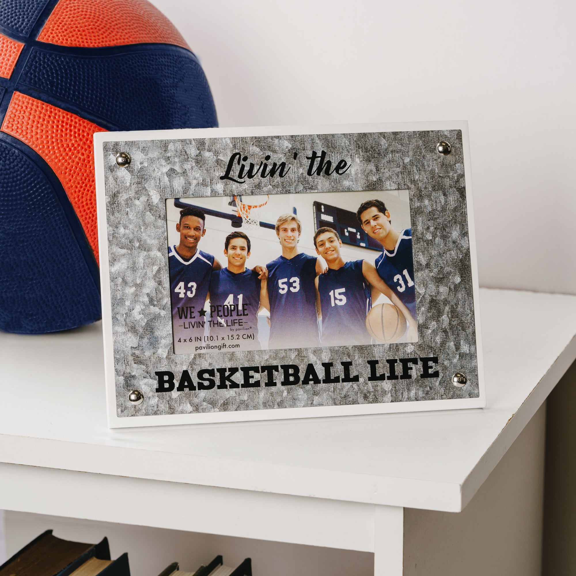 - IN-HOUSE DESIGN: Wood veneer and MDF is white, galvanized metal with secured pins is silver, constructed with a glass front. "Livin' The Basketball Life" black decal sentiment printed onto the metal layer. The sturdy paperboard backing has four metal turn tabs for photo replacement. Hinged easel back for tabletop display or metal triangle for wall display.