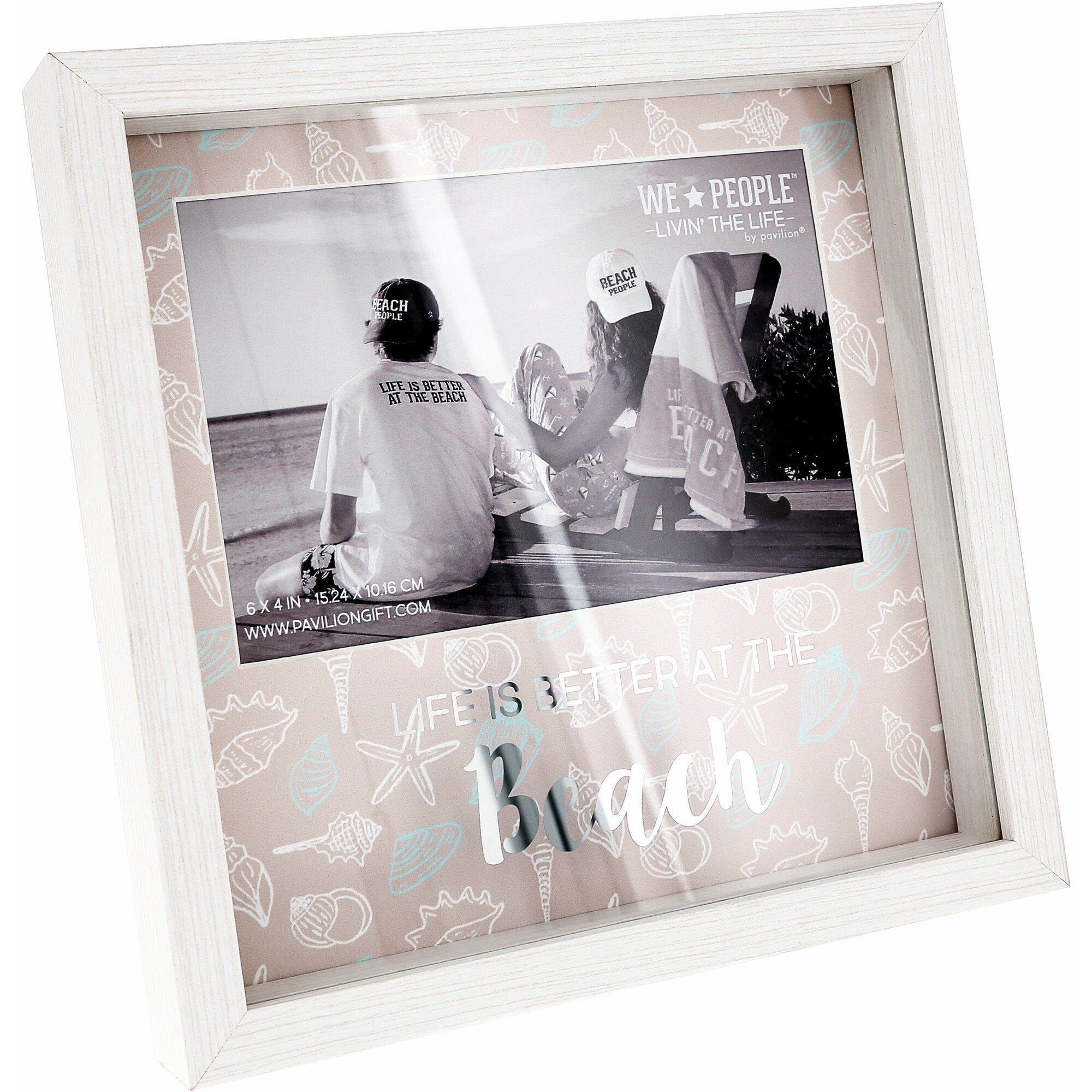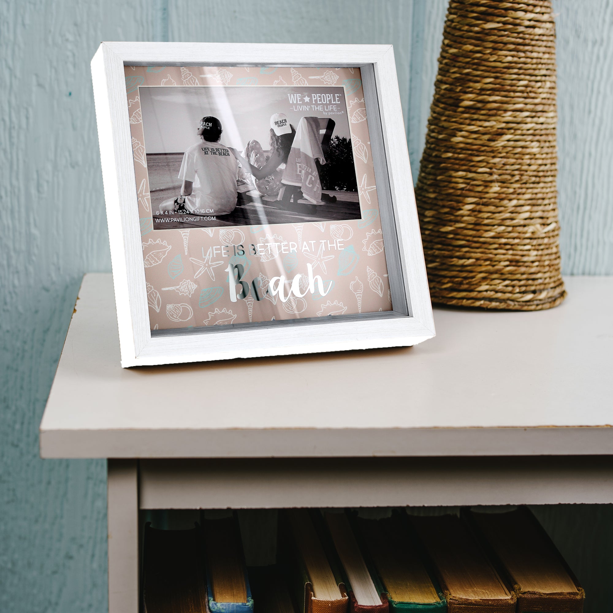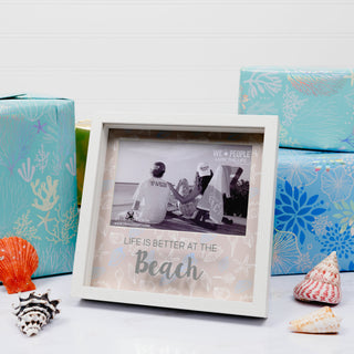 • IN-HOUSE DESIGN: The glass front has the electroplated silver sentiment "Life Is Better At The Beach." The mat board features a tan, white, aquamarine shell and starfish pattern. The backing is made from thick cardboard-like material with a metal hinged easel and triangle hanger for displaying and two metal tabs for photo replacement.