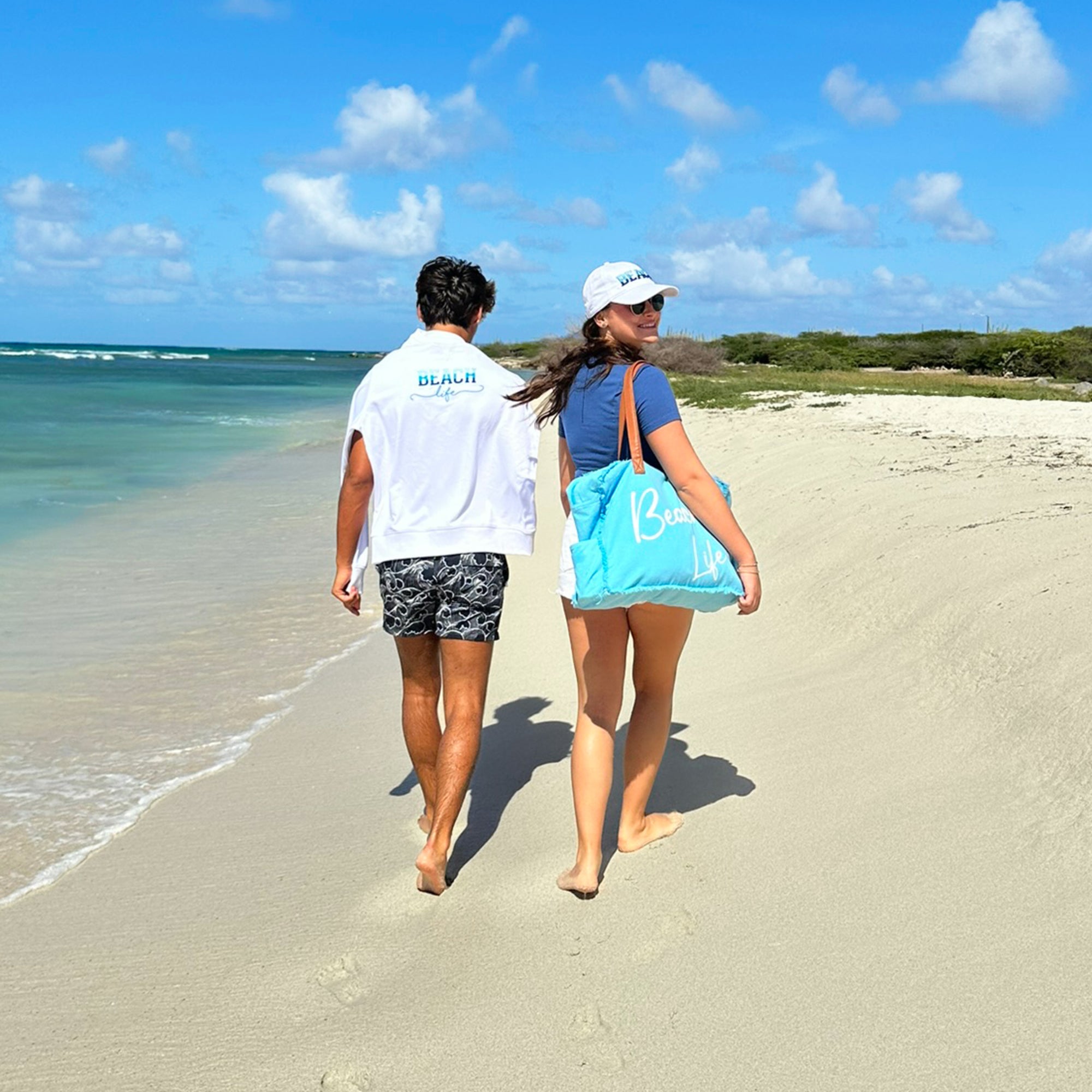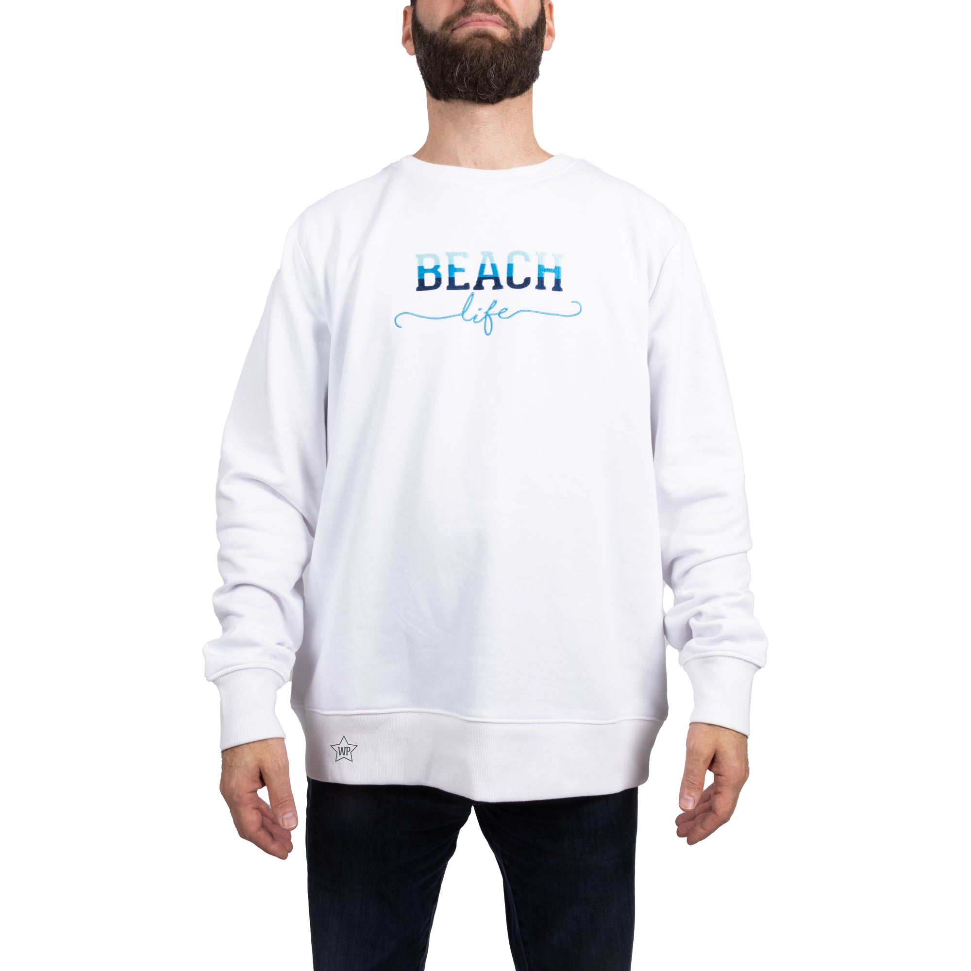 - IN-HOUSE DESIGN: The petite gray star icon is embroidered into the sweater's hem. The embroidered "Beach Life" sentiment sits in the center of the chest in a tri-color beach aqua and blue striped pattern. Size down for a regular women's fit, or order what you'd typically wear for a looser fit. These are also available in M/L and L/XL.