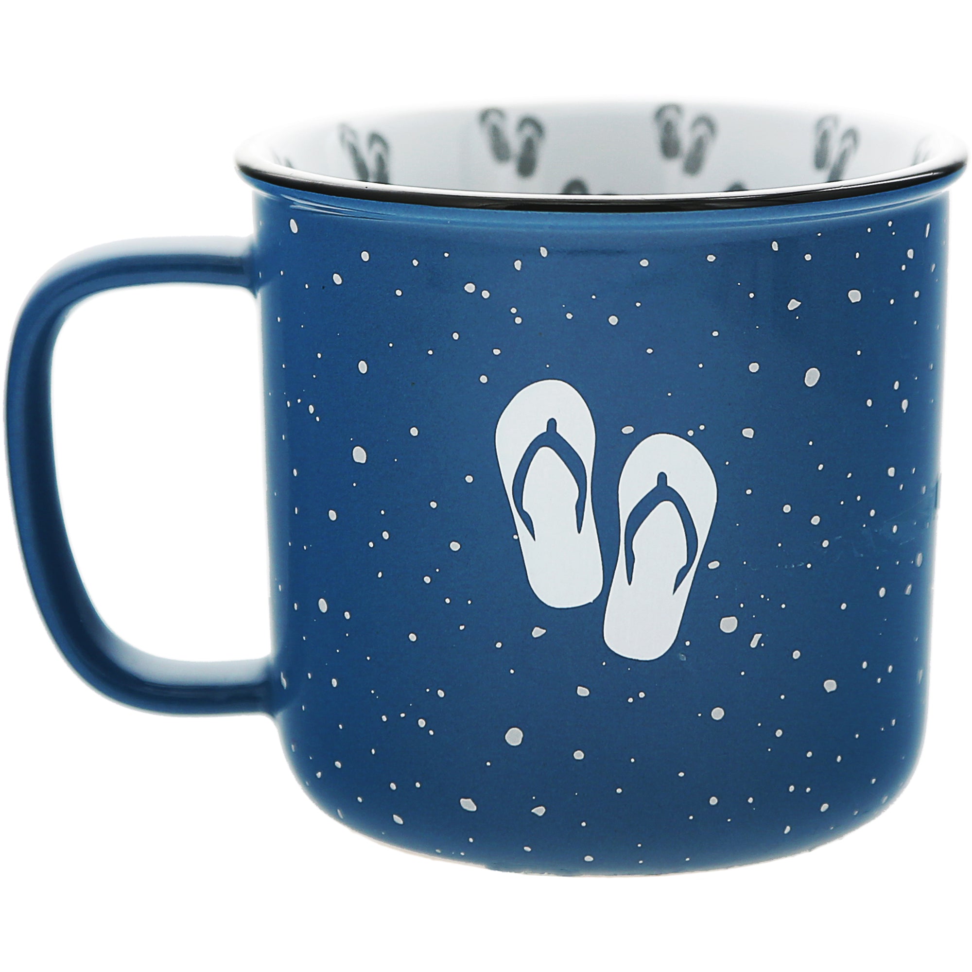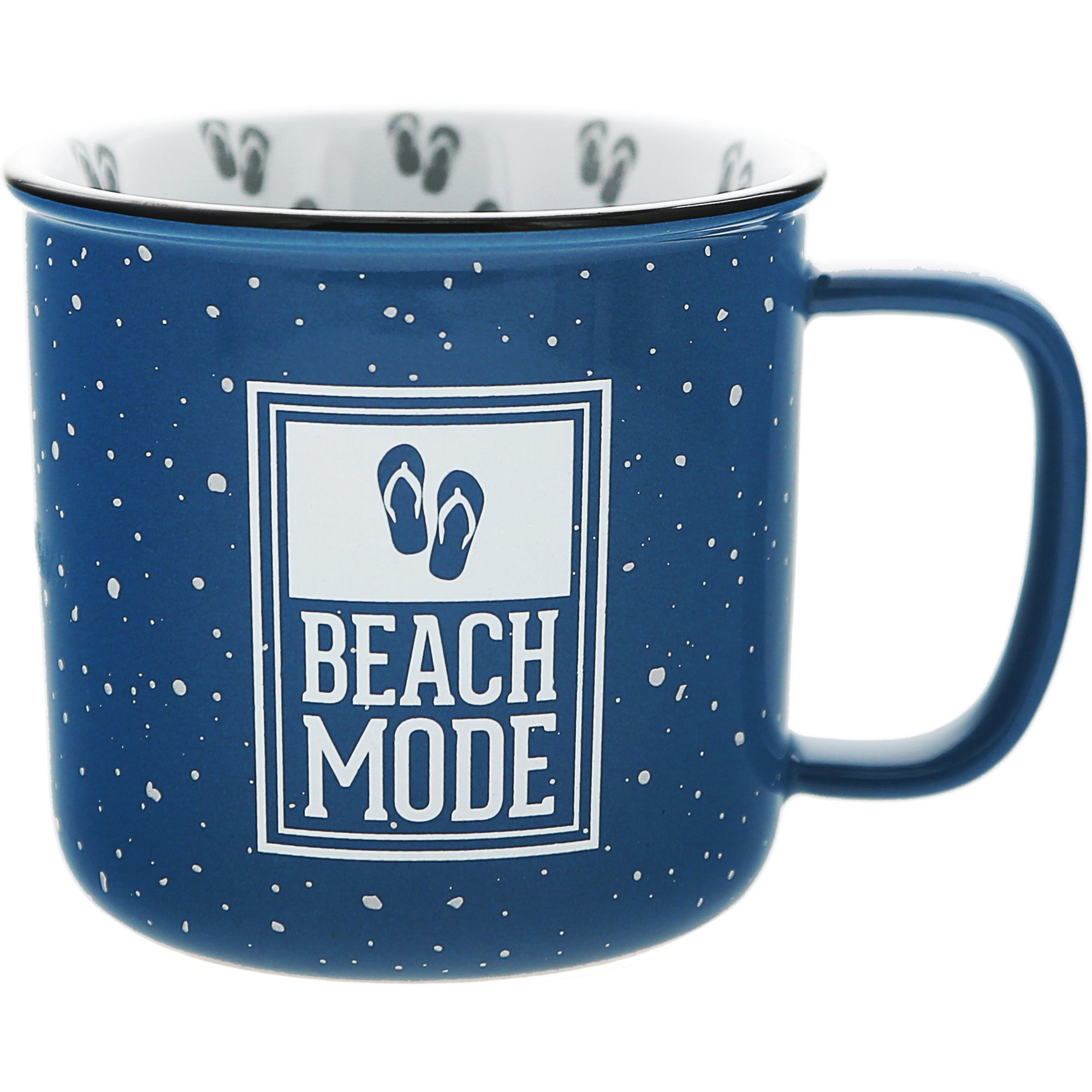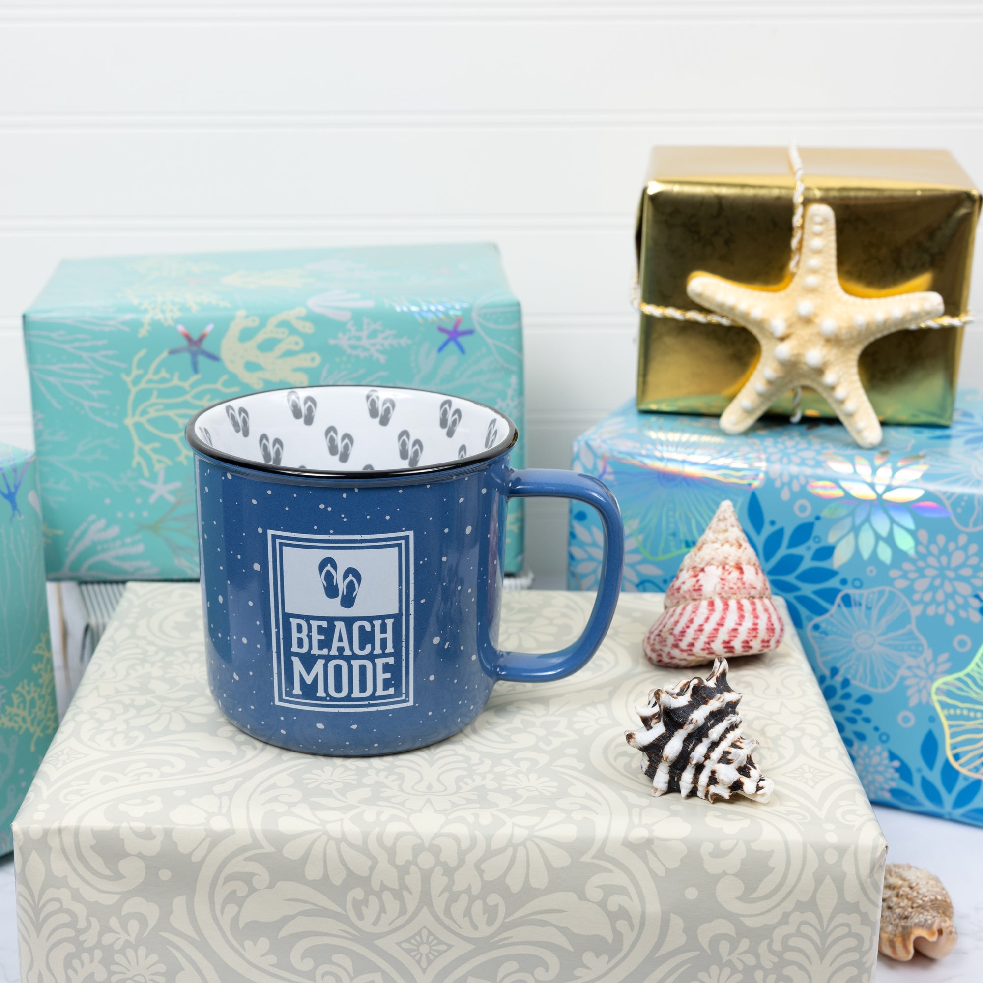 - IN-HOUSE DESIGN: The blue body has a white dotted and black lip exterior. One side has a large white pair of flip-flops in the center, whereas the other has a vertical rectangular outlined design with "Beach Mode" and a smaller blue set of flip-flops. The wrap-around interior design has tiny gray staggered flip-flops that reach from the top to the bottom of the interior walls. The overall finish is glossy on the interior and exterior.
