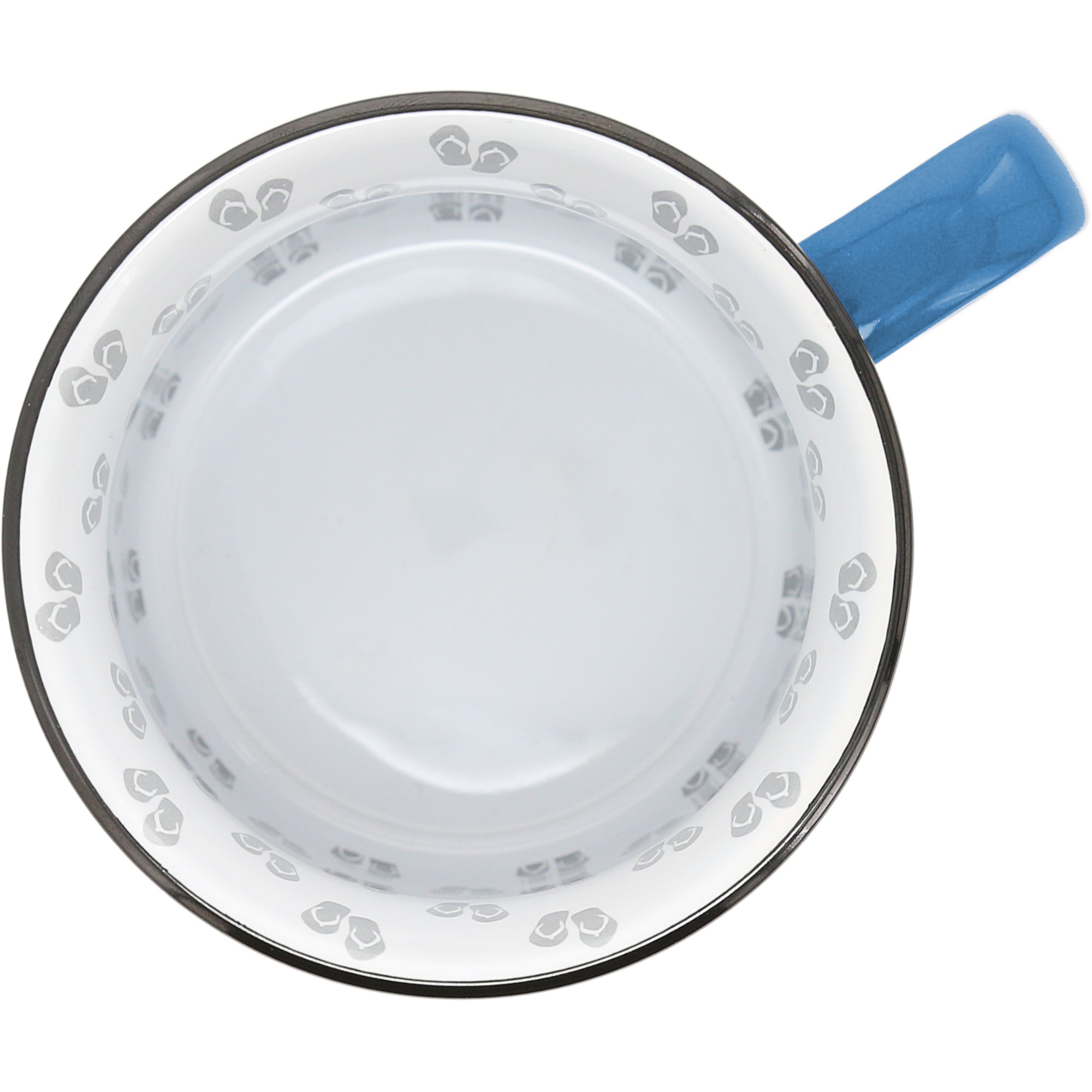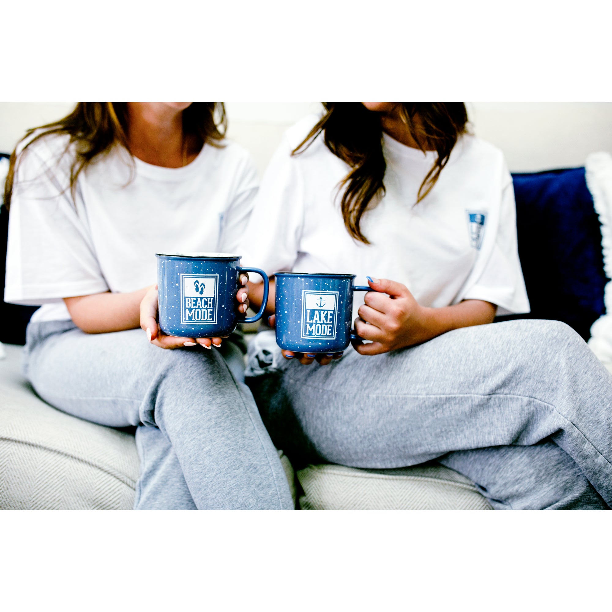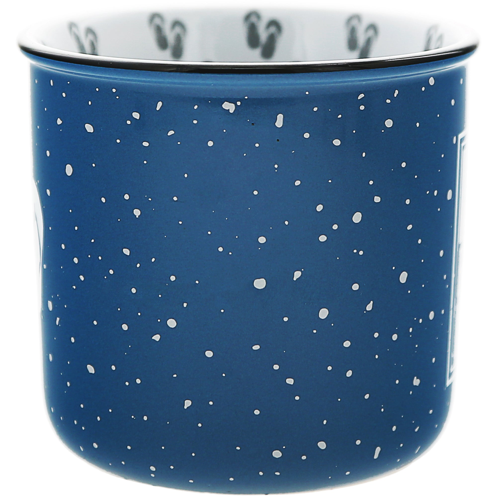 - IN-HOUSE DESIGN: The blue body has a white dotted and black lip exterior. One side has a large white pair of flip-flops in the center, whereas the other has a vertical rectangular outlined design with "Beach Mode" and a smaller blue set of flip-flops. The wrap-around interior design has tiny gray staggered flip-flops that reach from the top to the bottom of the interior walls. The overall finish is glossy on the interior and exterior.