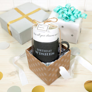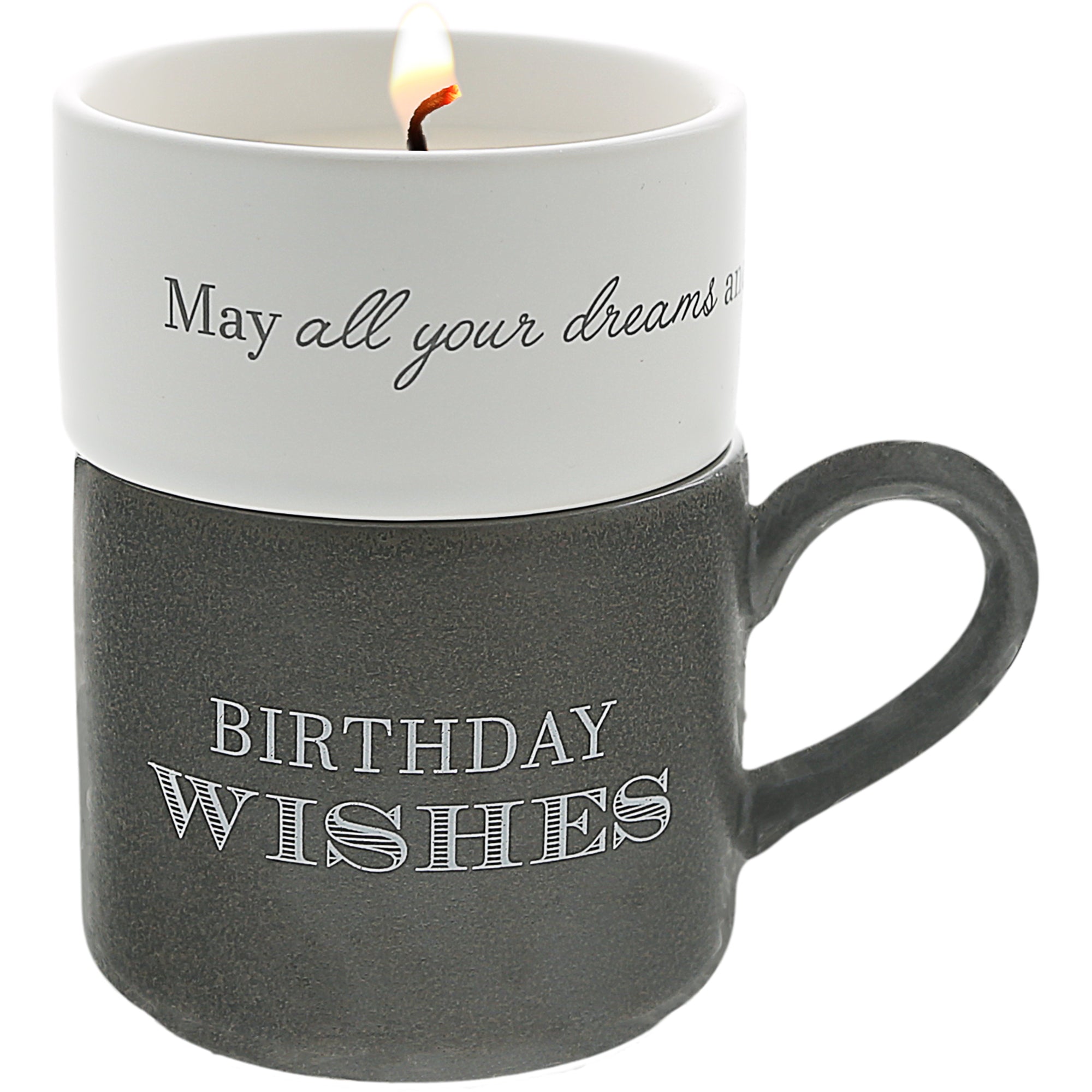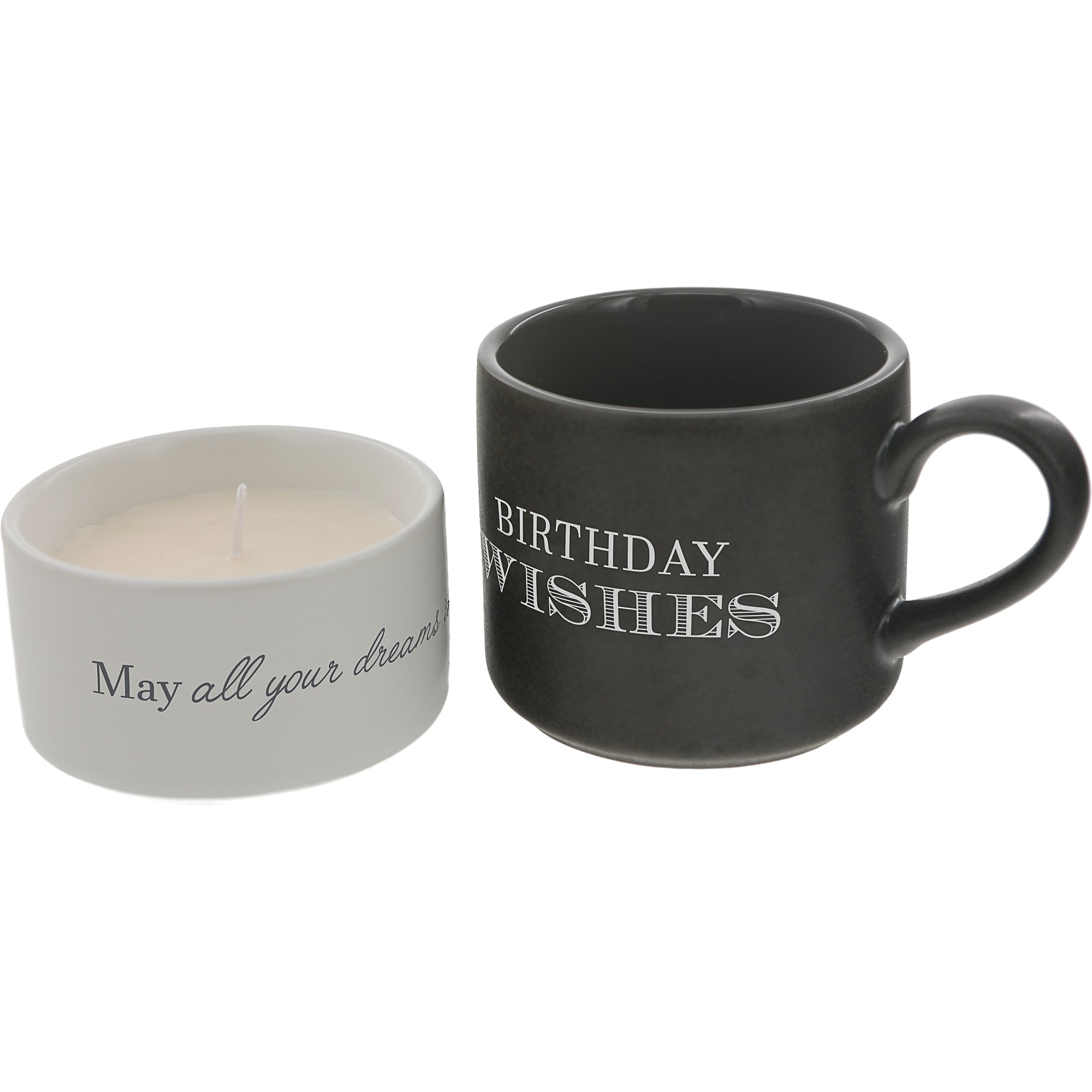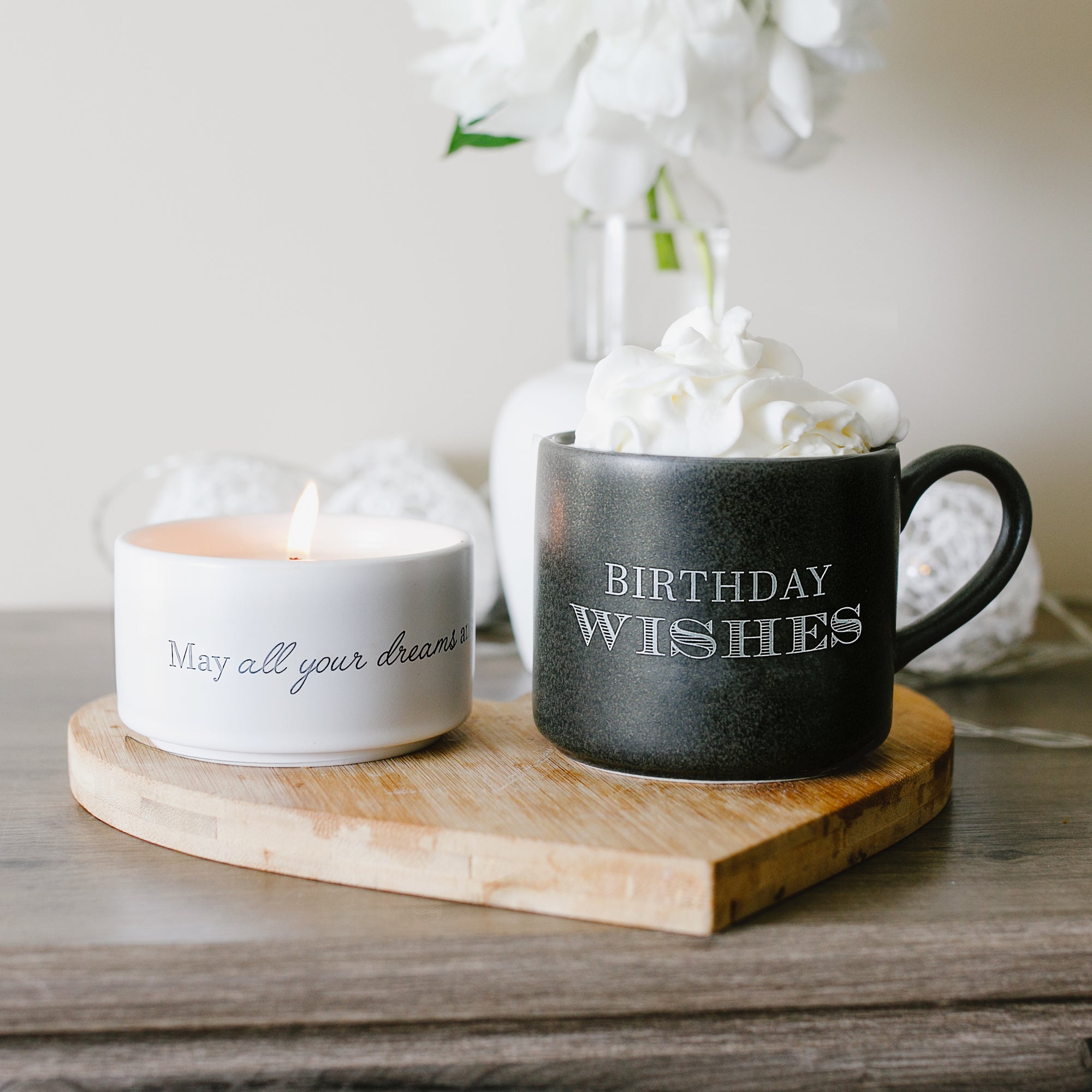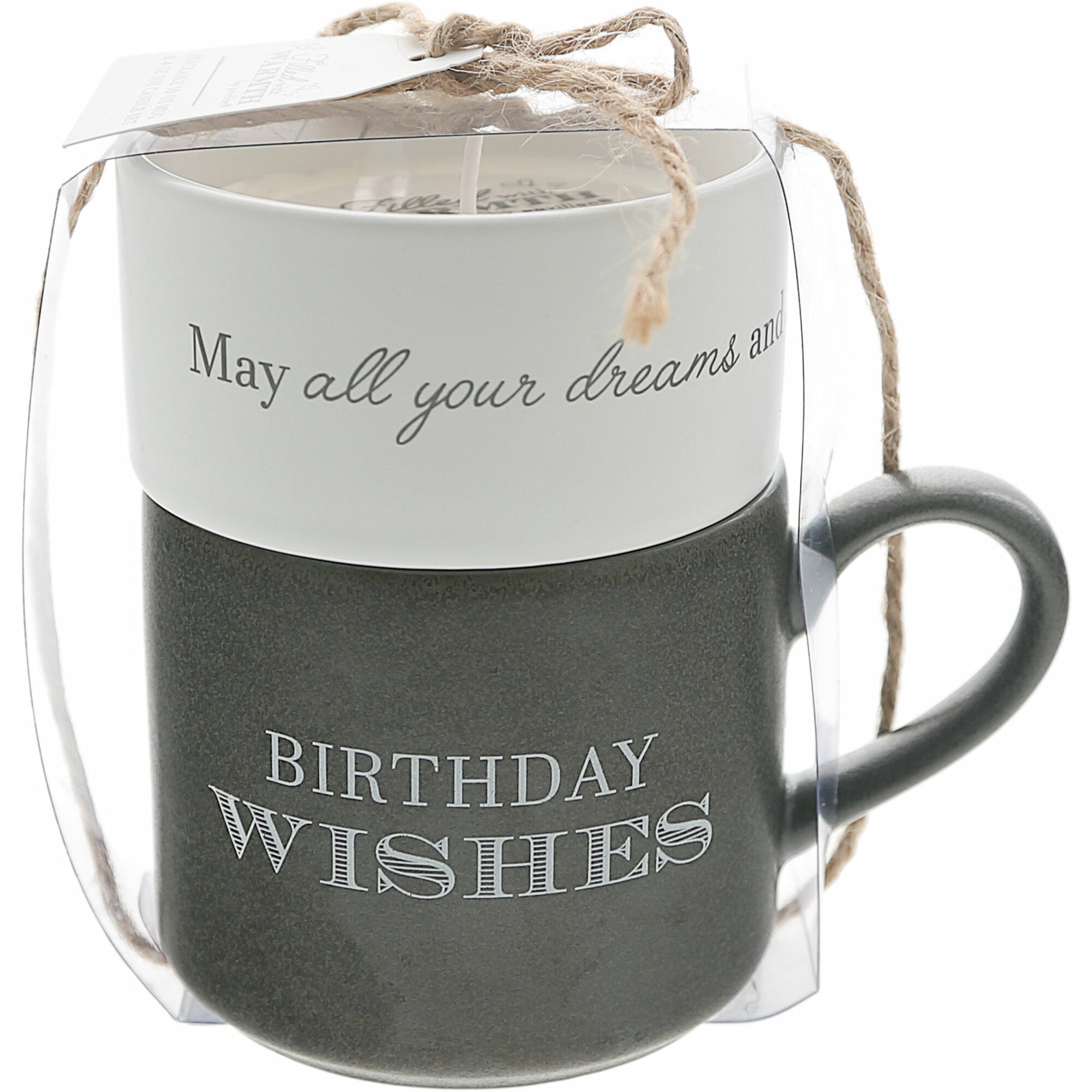 - IN-HOUSE DESIGN: Wrap-around white sentiment on the candle, "May All Of Your Dreams And Wishes Come True." The gray mug sentiment "Birthday Wishes" on the front side of the mug only. Faces towards you in the right hand or outward in the left hand.