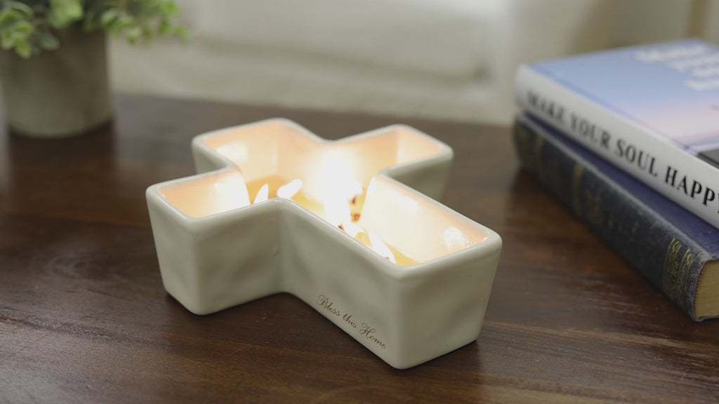 - IN-HOUSE DESIGN: The new & innovative candle offers a unique message for your loved one within the wax as time progresses. You will see a cursive written "Bless This Home With Love & Laughter" sentiment after about 10 minutes. As you watch, the entire decal with a black scroll design will appear after 60 minutes. Then, the message will hide again and reappear with each burn. The left side bottom of the candles has a simplistic "Bless This Home" tan decal. The 12-sided glossy finish vessel is shaped into a cross. The interior bottom has a tan "Bless This Home With Love & Laughter" permanent design.