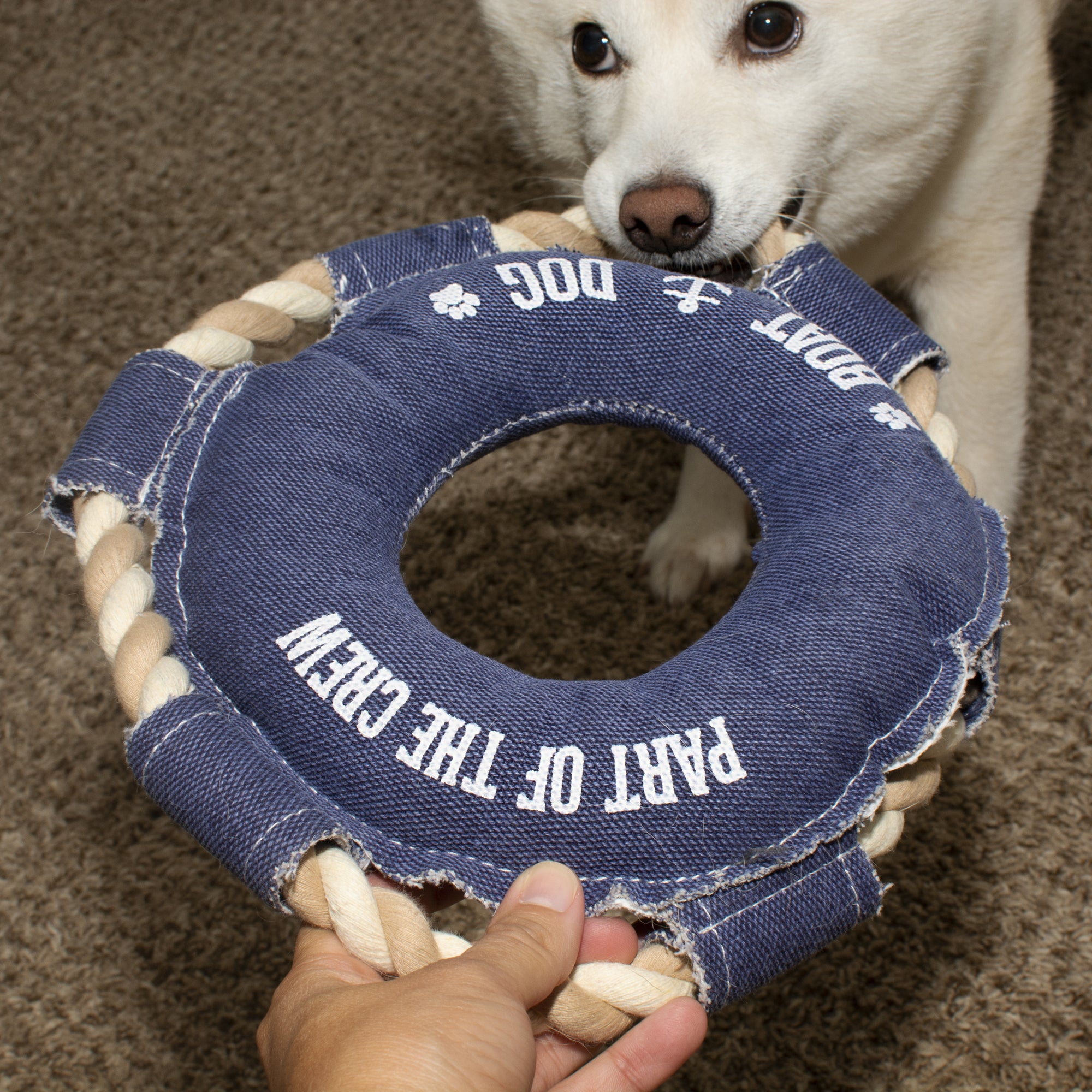 • PREMIUM QUALITY: This 10.75" tall, 10.75" long & 2" wide dog toy is made from durable materials—a blue background with white pawprints and anchor canvas-woven body that combines polyester and natural cotton. The edges of the buoy have a weathered rustic look. The fluffed-up polyester fiber-filled center with white stitching shapes contains a single plastic squeaker while attaching the secured wrap-around rope. The backside includes a branded tag.