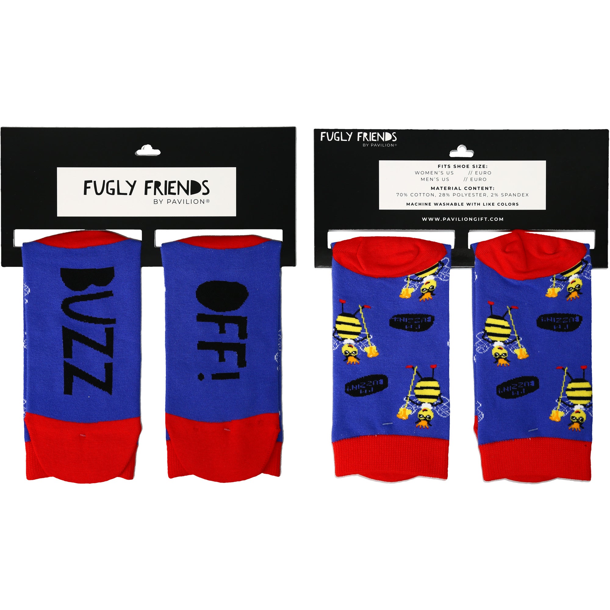 - IN-HOUSE DESIGN: "Buzz Off!" text is sewn into the base of the socks and is accompanied by a bee pattern with "I'm Buzzin'!" text.