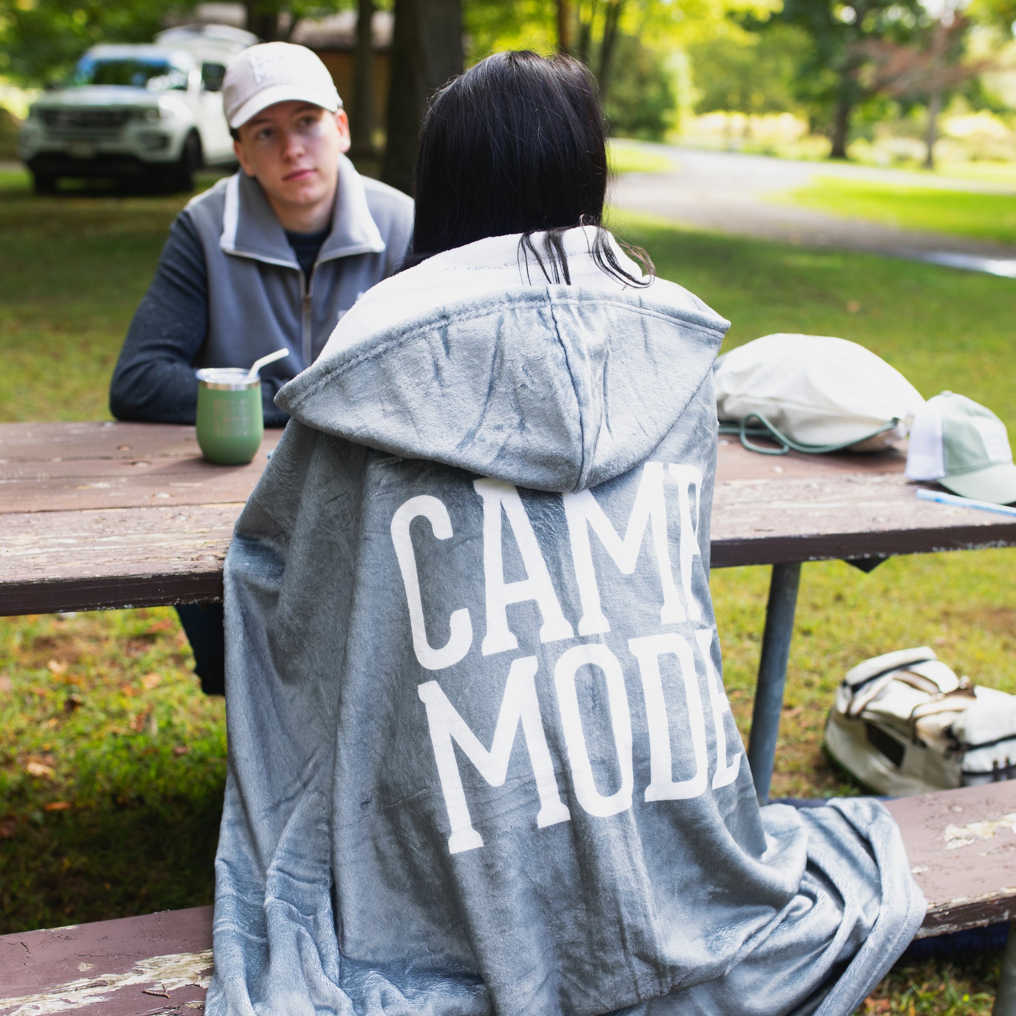 - IN-HOUSE DESIGN: All white interior with a gray exterior and large white "Camp Mode" sentiment printed onto the center back of the cloak. The pockets are perfect for putting hands into to wrap up tight with warmth and maybe even hold some small snacks or a phone.