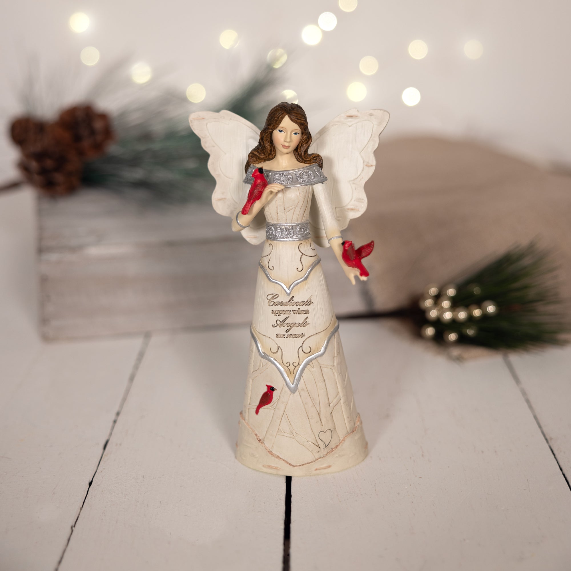 - IN-HOUSE DESIGN: The sentiment "Cardinals Appear When Angels Are Near" is carved in cursive on the center of the bottom half of the dress. The angel statue holds a cardinal in her hands and the tree branches at the bottom of her dress. Her other hand holds a lantern. Her beautiful mid-length hair rests neatly on her shoulders and back. The silver damask-styled silver details bring her to life.