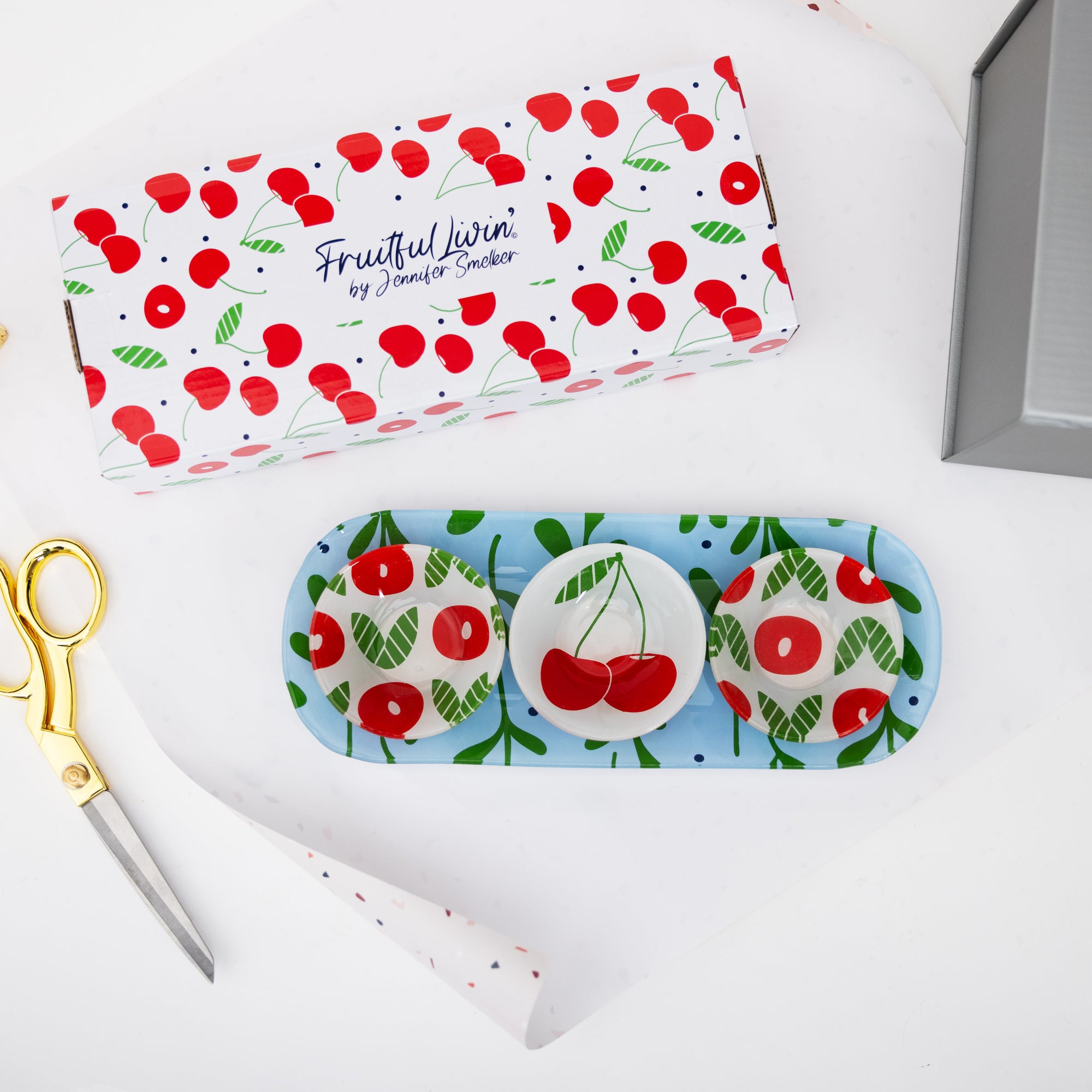 - IN-HOUSE DESIGN: All of the bowls have a white background. One bowl has a stemmed pair of cherries, and the other two bowls have a matching leaf and cherry design. The tray has a blue background, polka dots, and greenery.