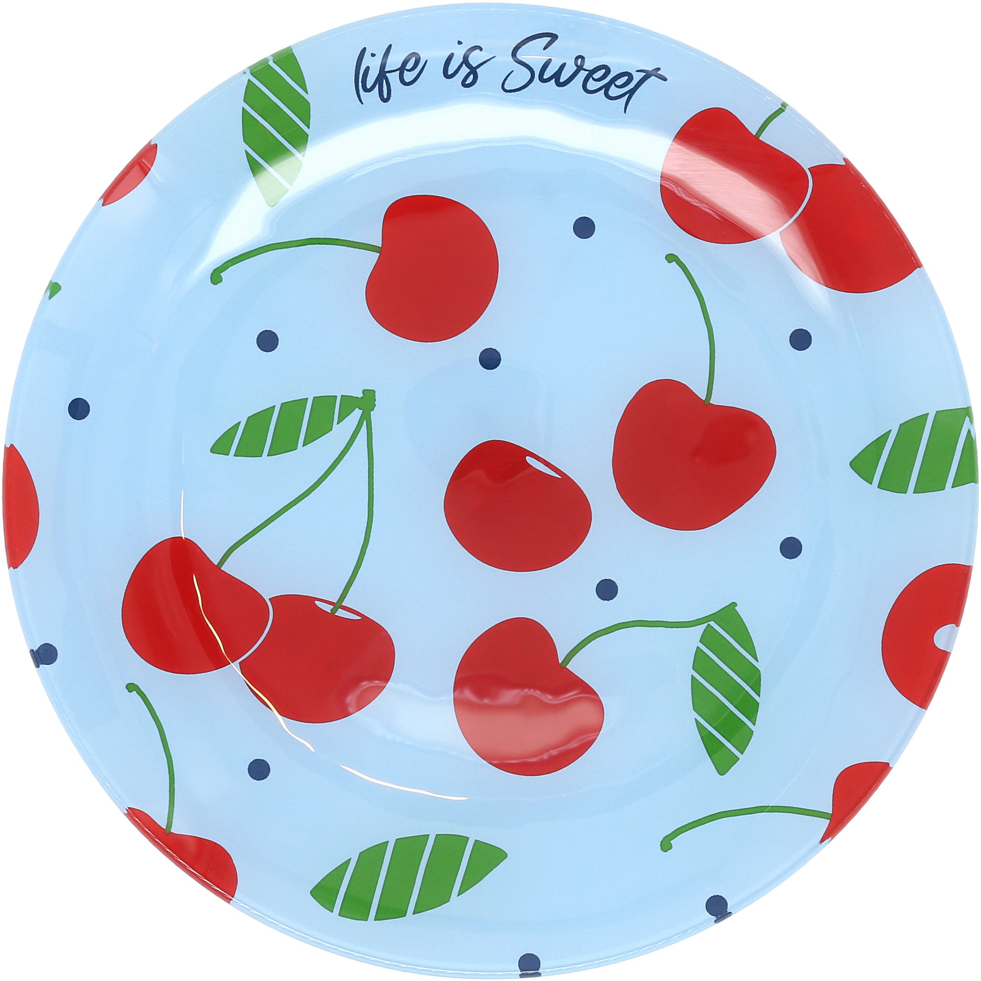 - IN-HOUSE DESIGN: The blue background encompasses red cherries with green stems accompanied by blue polka dots. The "Life Is Sweet" sentiment is on the rim of the appetizer plate.