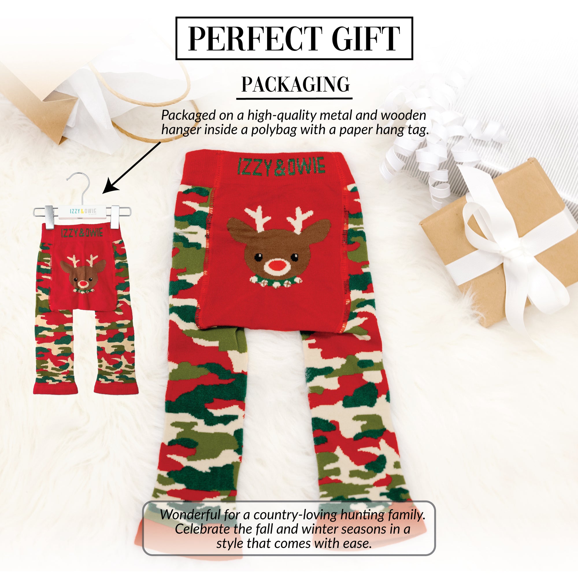 - IN-HOUSE DESIGN: The red, green, and tan camouflage pattern covers the entire front, whereas the back has a solid red panel with a buck/deer with beige antlers and a bell collar. The ankles and stretchy waistband are also solid red.