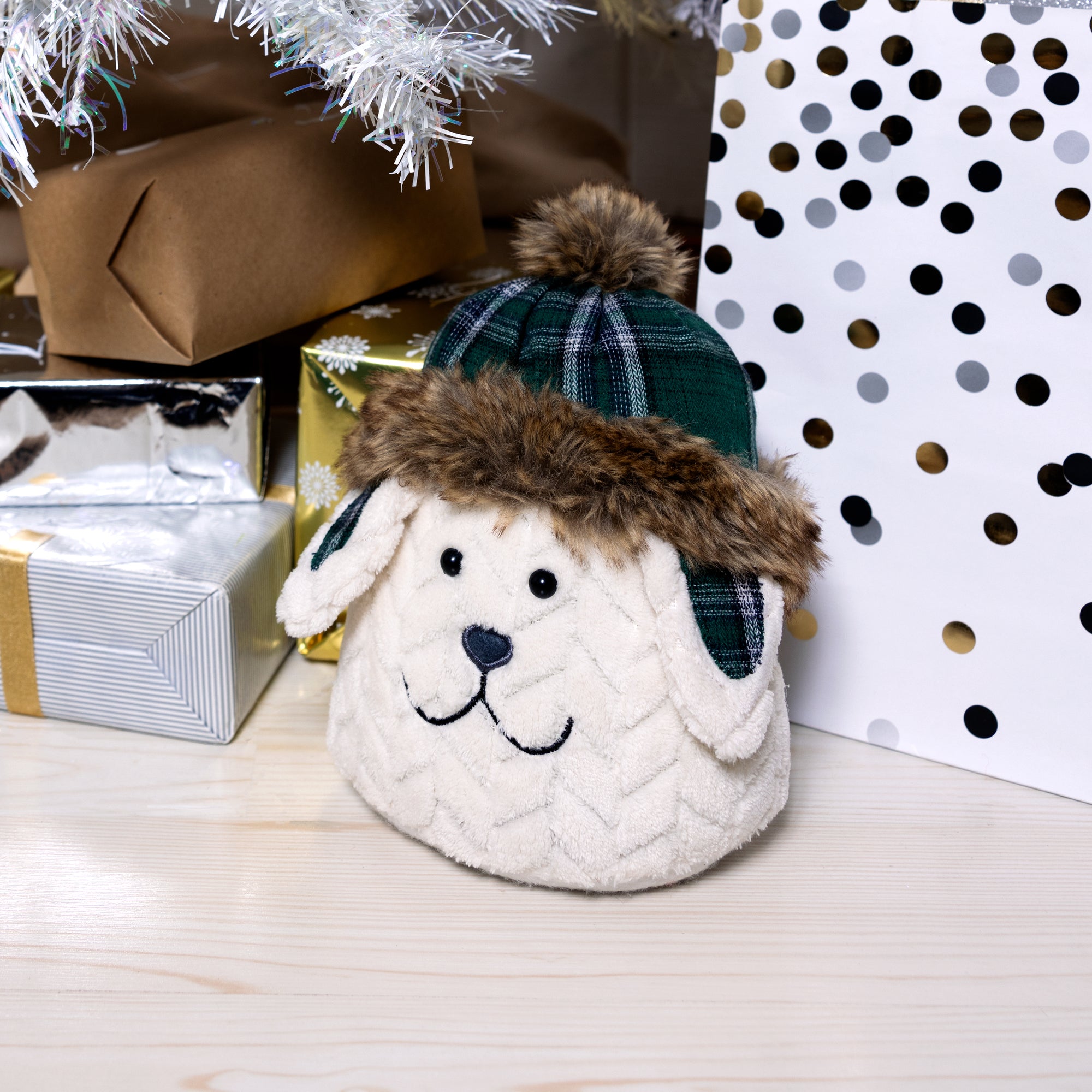 • PREMIUM QUALITY: The dog has a black embroidered face, a felt gray nose, and plastic black and gray eyes. The fluffy brown fur-trimmed winter hat sits on the dog's head. Meanwhile, the green plaid details and debossed white chevron patterns are made from 100% polyester. The interior has fluffing, weighted beads, and a felt bottom to protect floors and hardwood surfaces.