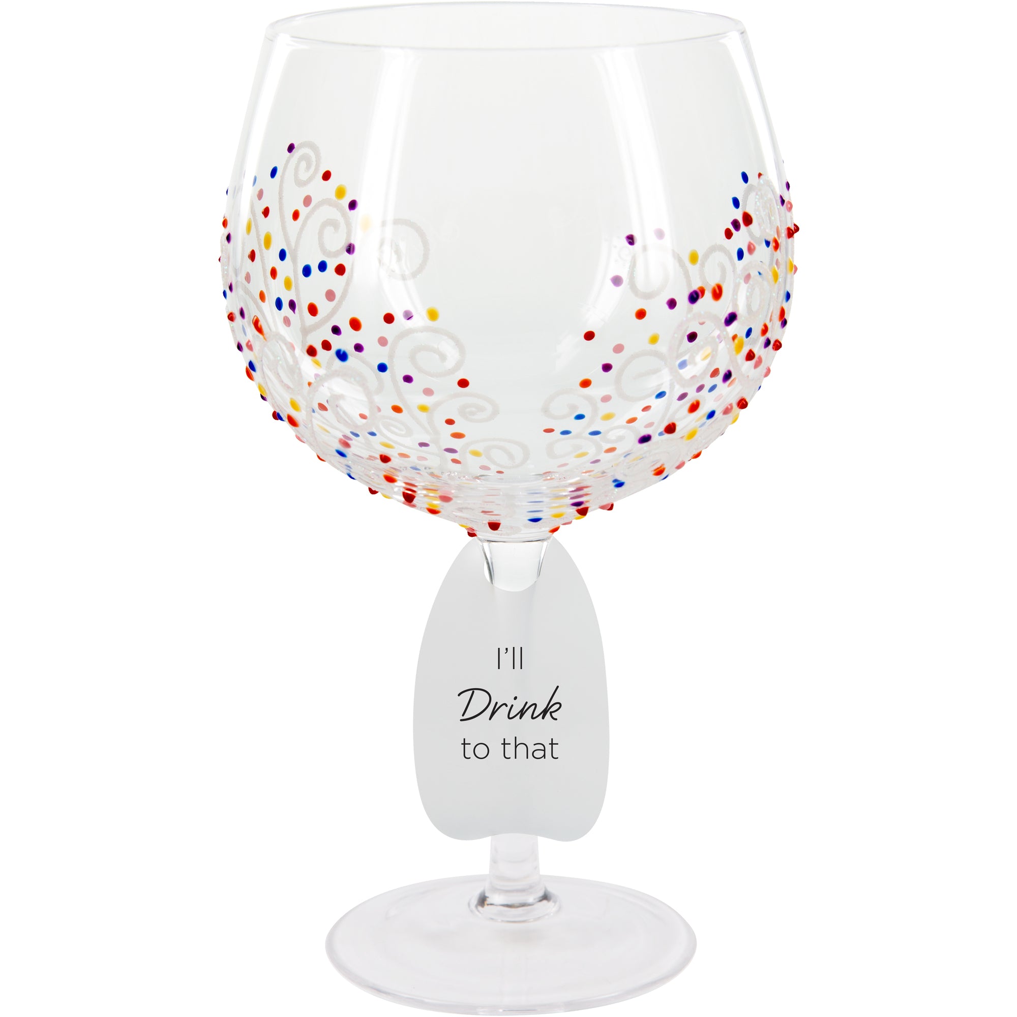 - IN-HOUSE DESIGN: Features hand-painted multi-colored swirl detailing and printed "I'll Drink To That" text on the included removable tag.