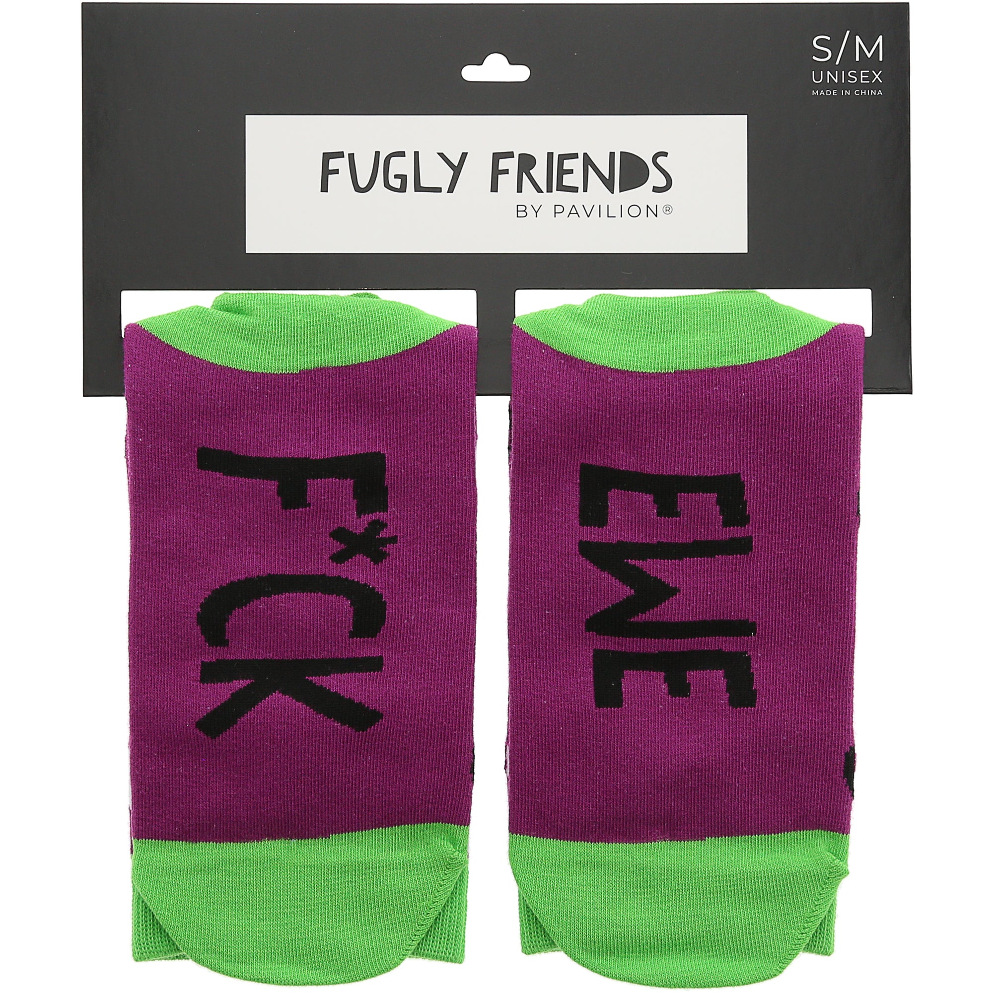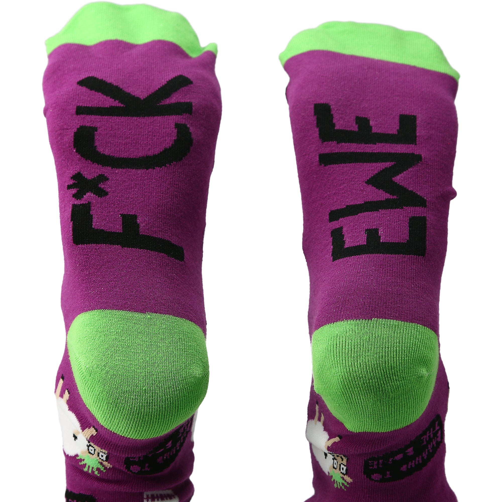 - IN-HOUSE DESIGN: Green ankle, heel, and toes are attached to an overall purple body. The waving sheep characters have black eyeliner, green hair, and a black studded collar around their neck—repetitive black speech bubbles with "BAAAHHD TO THE BONE" in purple font. One sock bottom has "F*CK" sentiment while the opposite has "EWE" sentiment in black.