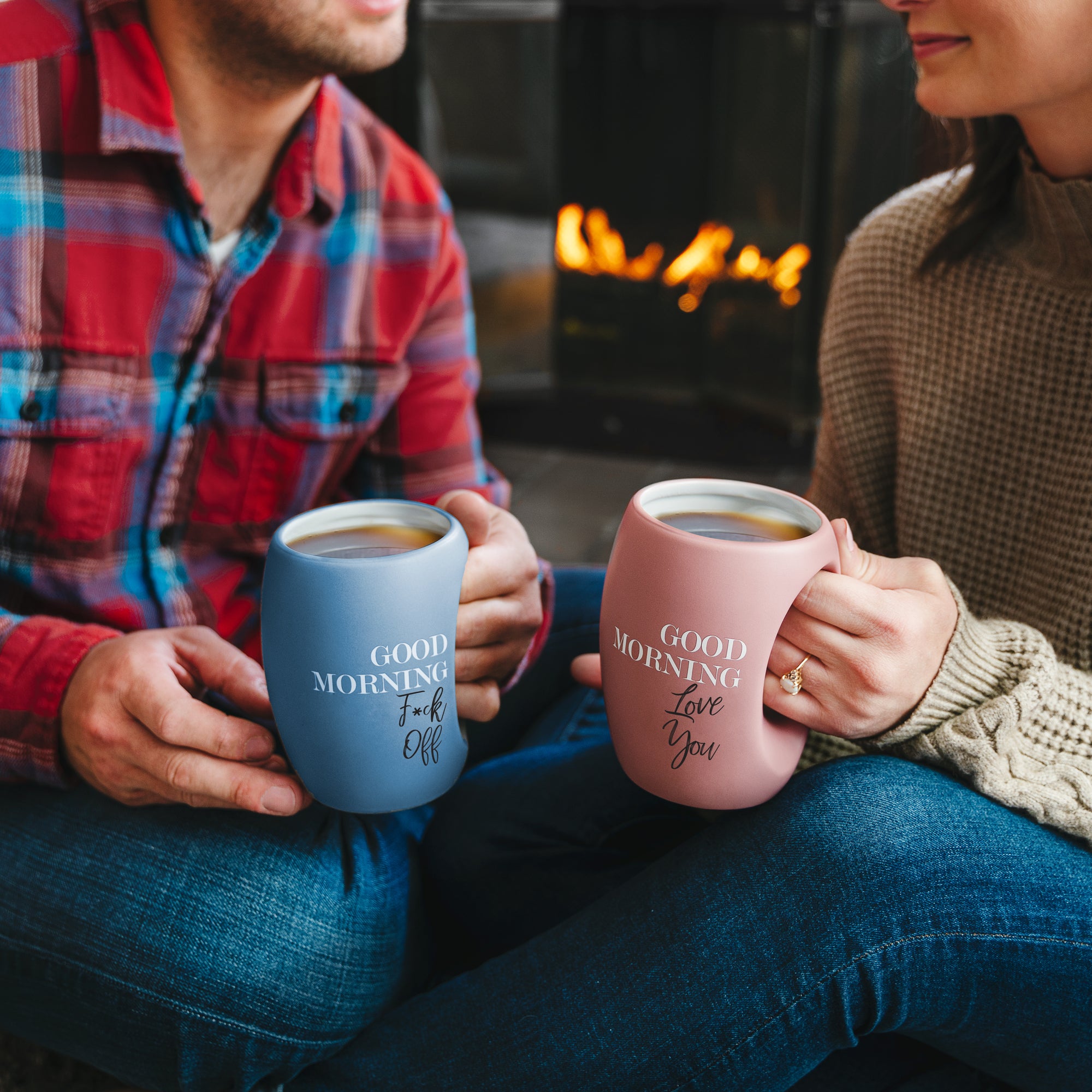 - IN-HOUSE DESIGN: "Good Morning Fuck Off" white and black sentiment decal on the front side of the matte blue cup. The Interior is white and has a glossy glaze prop 65 food-safe finish. We designed and created this mug to blend in with any of your kitchen's current drinkware collections with a refined, modern, and aesthetically pleasing look paired with humor and relatable sentiment.
