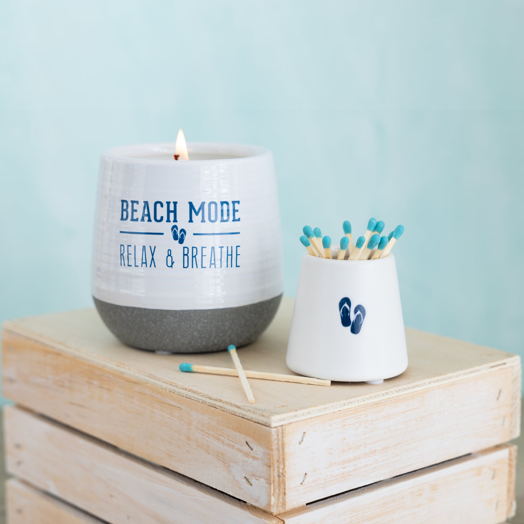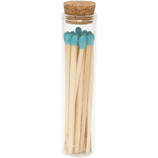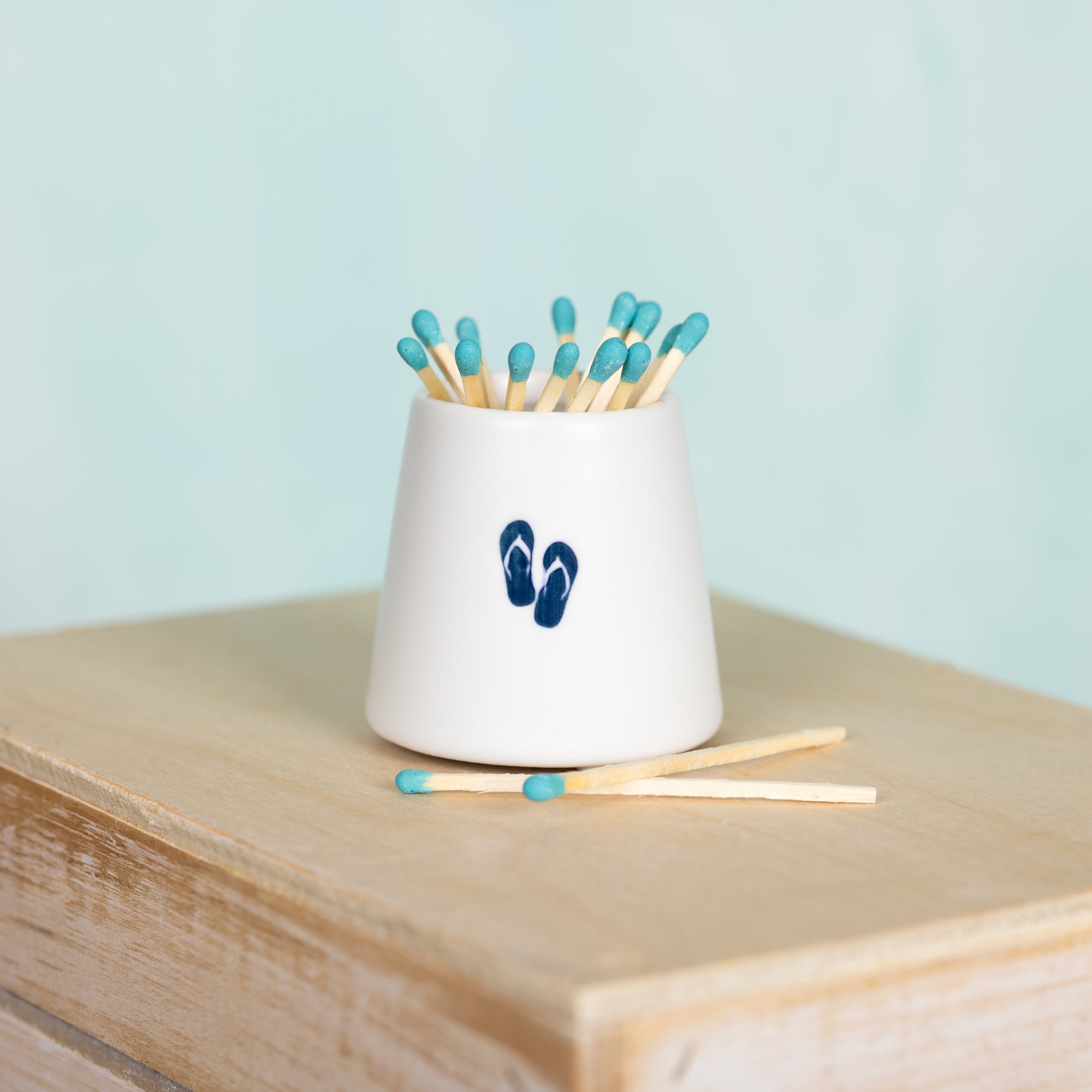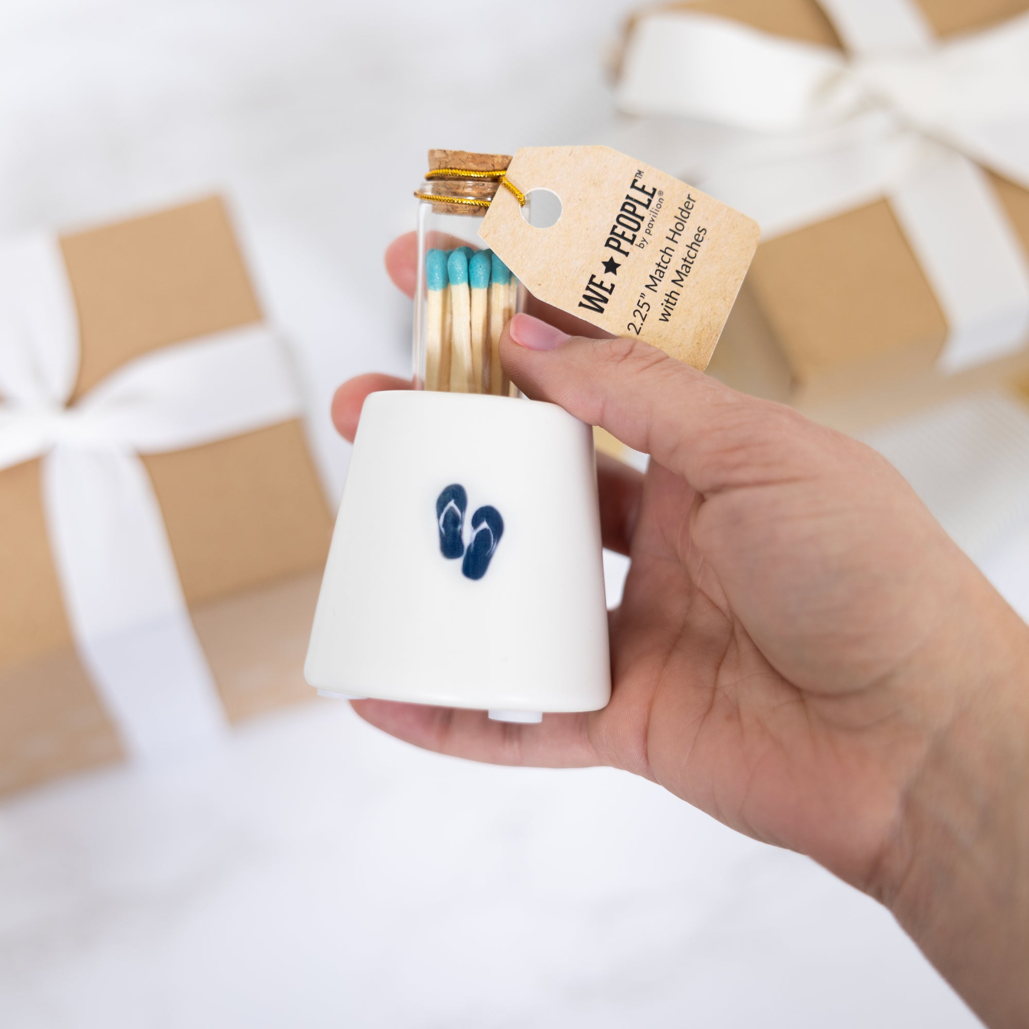 • IN-HOUSE DESIGN: The matte white glass vessel has a stamped pair of blue flip-flops in the front center. The tips of the 15 light brown matches are teal. The 3.75" cylindrical clear glass container has a gold bunchy tie and a brown craft tag at the top. Reuse the match holder as a tiny treasure keepsake bottle.
